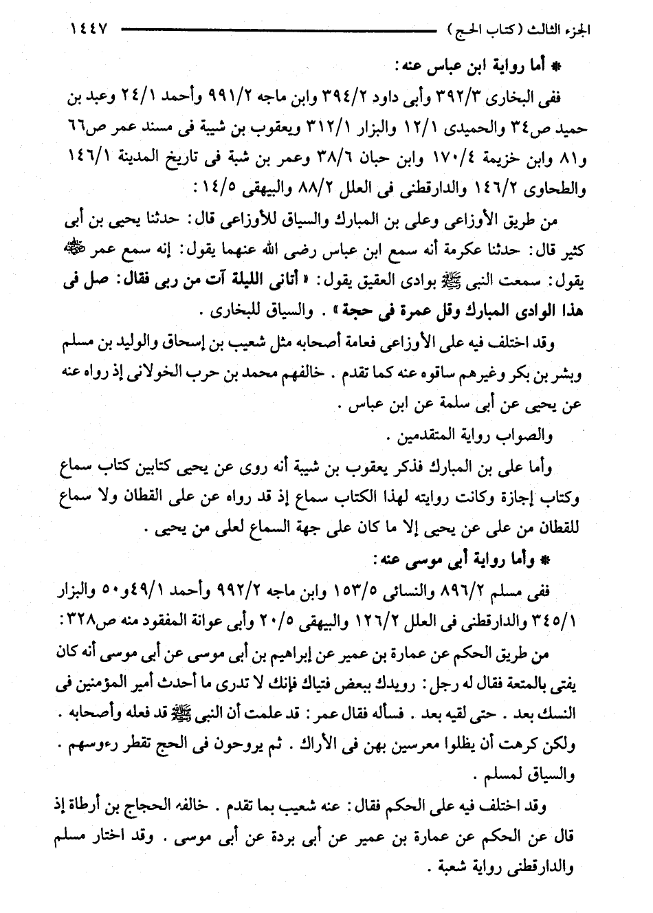 من طريق الحكم عن عمارة بن عمير عن إبراهيم بن أبى موسى عن أبى موسى أنه كان يفتى بالمتعة فقال له رجل: رويدك ببعض فتياك فإنك لا تدرى ما أحدث أمير المؤمنين في النسك بعد. حتى لقيه بعد. فسأله فقال عمر: قد علمت أن النبي - صلى الله عليه وسلم - قد فعله وأصحابه. ولكن كرهت أن يظلوا معرسين بهن في الأراك. ثم يروحون في الحج تقطر رءوسهم. والسياق لمسلم.