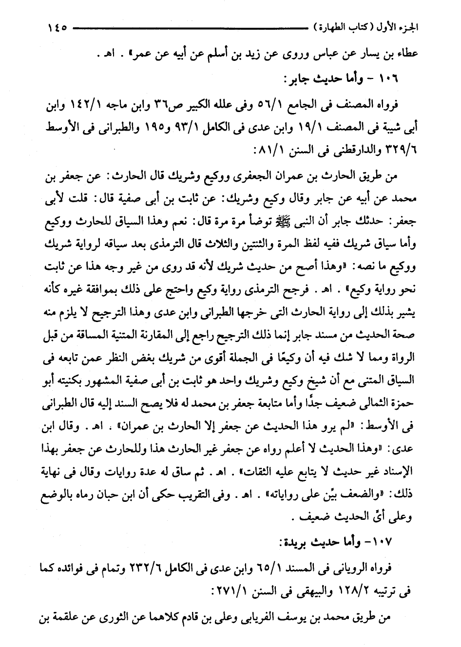 فرواه المصنف في الجامع 1/ 56 وفى علله الكبير ص 36 وابن ماجه 1/ 142 وابن أبى شيبة في المصنف 1/ 19 وابن على في الكامل 1/ 93 و 195 والطبراني في الأوسط 6/ 329 والدارقطني في السنن 1/ 81: