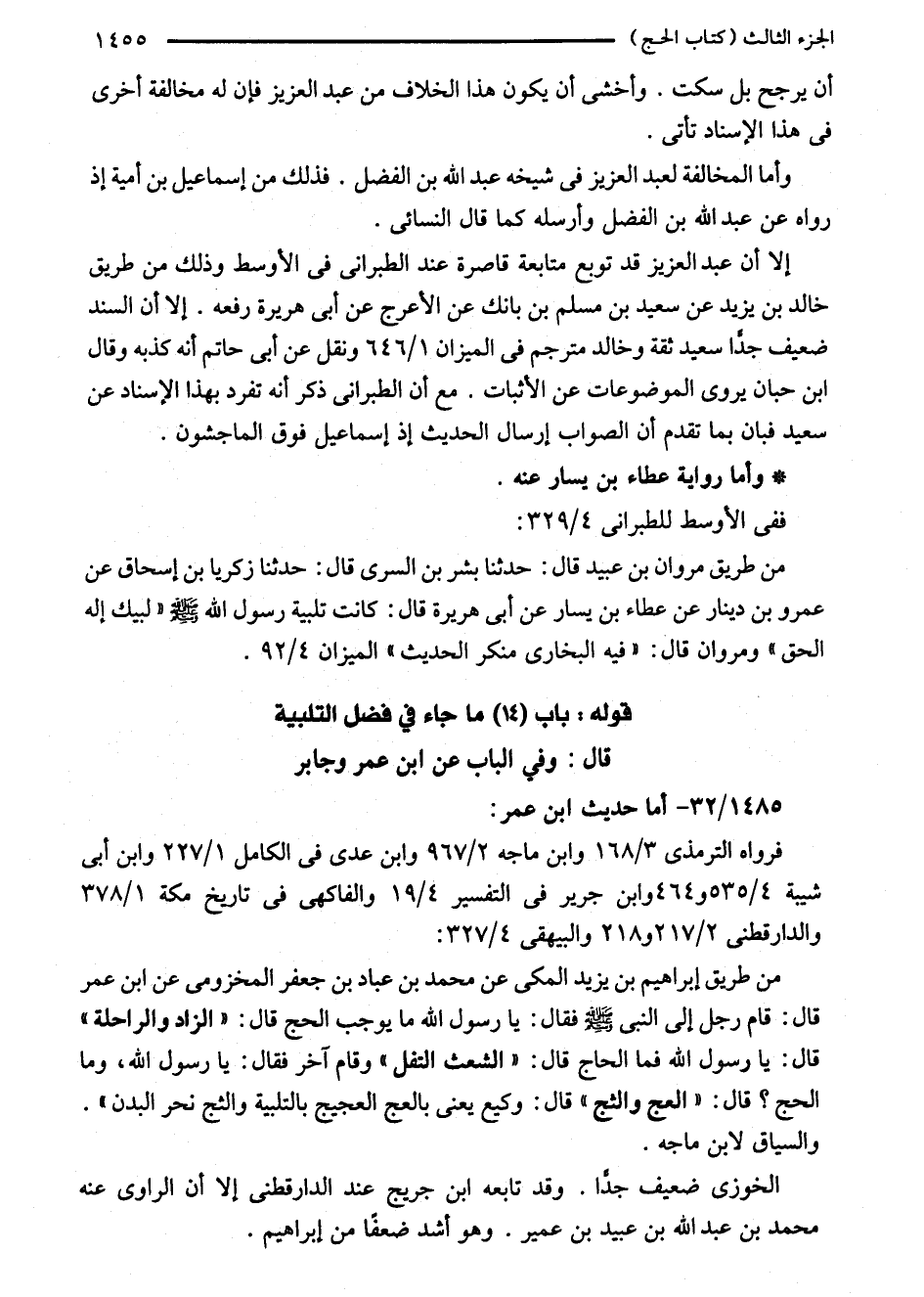 من طريق إبراهيم بن يزيد المكى عن محمد بن عباد بن جعفر المخزومى عن ابن عمر قال: قام رجل إلى النبي - صلى الله عليه وسلم - فقال: يا رسول الله ما يوجب الحج قال: "الزاد والراحلة" قال: يا رسول الله فما الحاج قال: "الشعث التفل" وقام آخر فقال: يا رسول الله، وما الحج؟ قال: "العج والثج" قال: وكيع يعنى بالعج العجيج بالتلبية والثج نحر البدن". والسياق لابن ماجه.