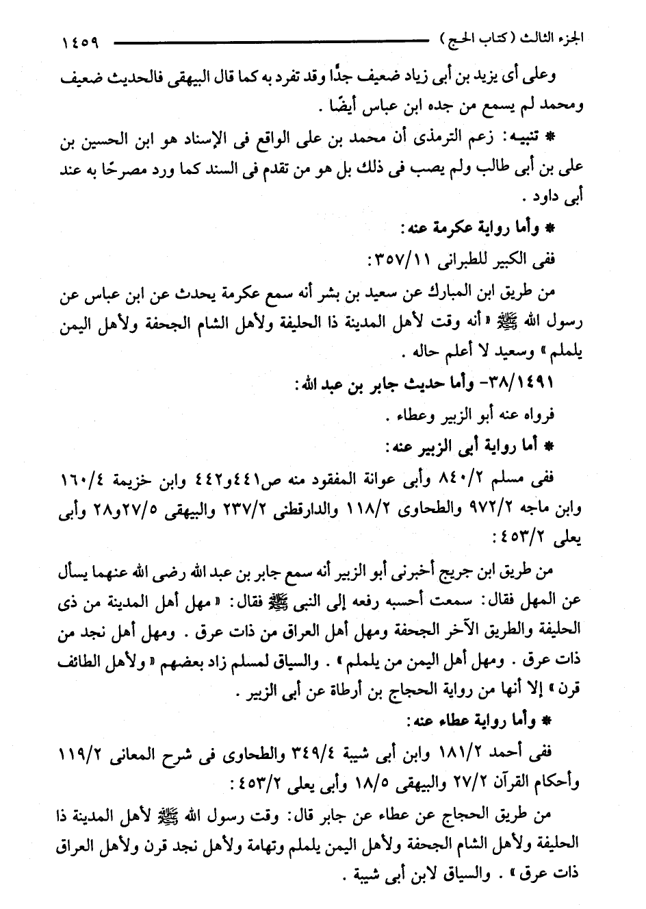 من طريق الحجاج عن عطاء عن جابر قال: وقت رسول الله - صلى الله عليه وسلم - لأهل المدينة ذا الحليفة ولأهل الشام الجحفة ولأهل اليمن يلملم وتهامة ولأهل نجد قرن ولأهل العراق ذات عرق". والسياق لابن أبى شيبة.