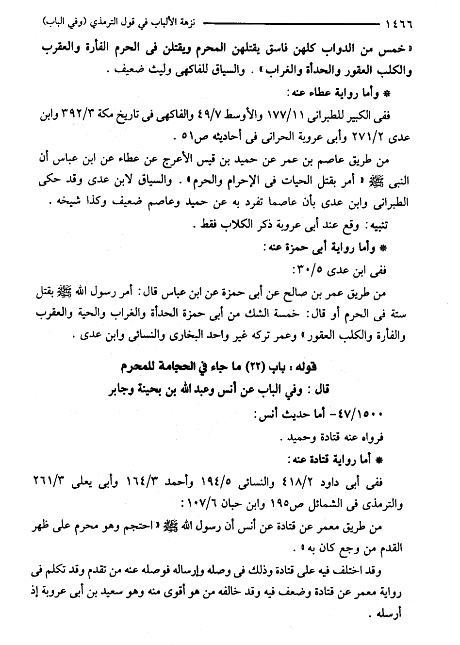 من طريق عمر بن صالح عن أبى حمزة عن ابن عباس قال: أمر رسول الله - صلى الله عليه وسلم - بقتل ستة في الحرم أو قال: خمسة الشك من أبى حمزة الحدأة والغراب والحية والعقرب والفأرة والكلب العقور" وعمر تركه غير واحد البخاري والنسائي وابن عدى.