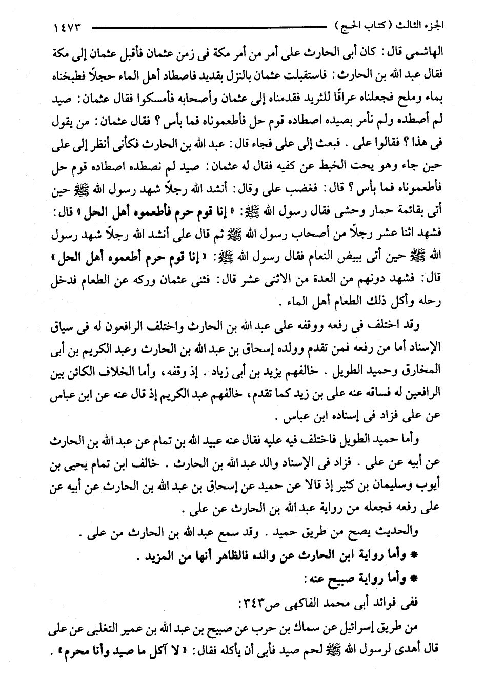 الهاشمى قال: كان أبى الحارث على أمر من أمر مكة في زمن عثمان فأقبل عثمان إلى مكة فقال عبد الله بن الحارث: فاستقبلت عثمان بالنزل بقديد فاصطاد أهل الماء حجلاً فطبخناه بماء وملح فجعلناه عرافا للثريد فقدمناه إلى عثمان وأصحابه فأمسكوا فقال عثمان: صيد لم أصطده ولم نامر بصيده اصطاده قوم حل فاطعموناه فما بأس؟ فقال عثمان: من يقول في هذا؟ فقالوا على. فبعث إلى على فجاء قال: عبد الله بن الحارث فكأنى أنظر إلى على حين جاء وهو يحت الخبط عن كفيه فقال له عثمان: صيد لم نصطده اصطاده قوم حل فأطعموناه فما بأس؟ قال: فغضب على وقال: أنشد الله رجلًا شهد رسول الله - صلى الله عليه وسلم - حين أتى بقائمة حمار وحشى فقال رسول الله - صلى الله عليه وسلم -: "إنا قوم حرم فأطعموه أهل الحل" قال: فشهد اثنا عشر رجلًا من أصحاب رسول الله - صلى الله عليه وسلم - ثم قال على أنشد الله رجلًا شهد رسول الله - صلى الله عليه وسلم - حين أتى ببيض النعام فقال رسول الله - صلى الله عليه وسلم -: "إنا قوم حرم أطعموه أهل الحل" قال: فشهد دونهم من العدة من الاثنى عشر قال: فثنى عثمان وركه عن الطعام فدخل رحله وأكل ذلك الطعام أهل الماء.