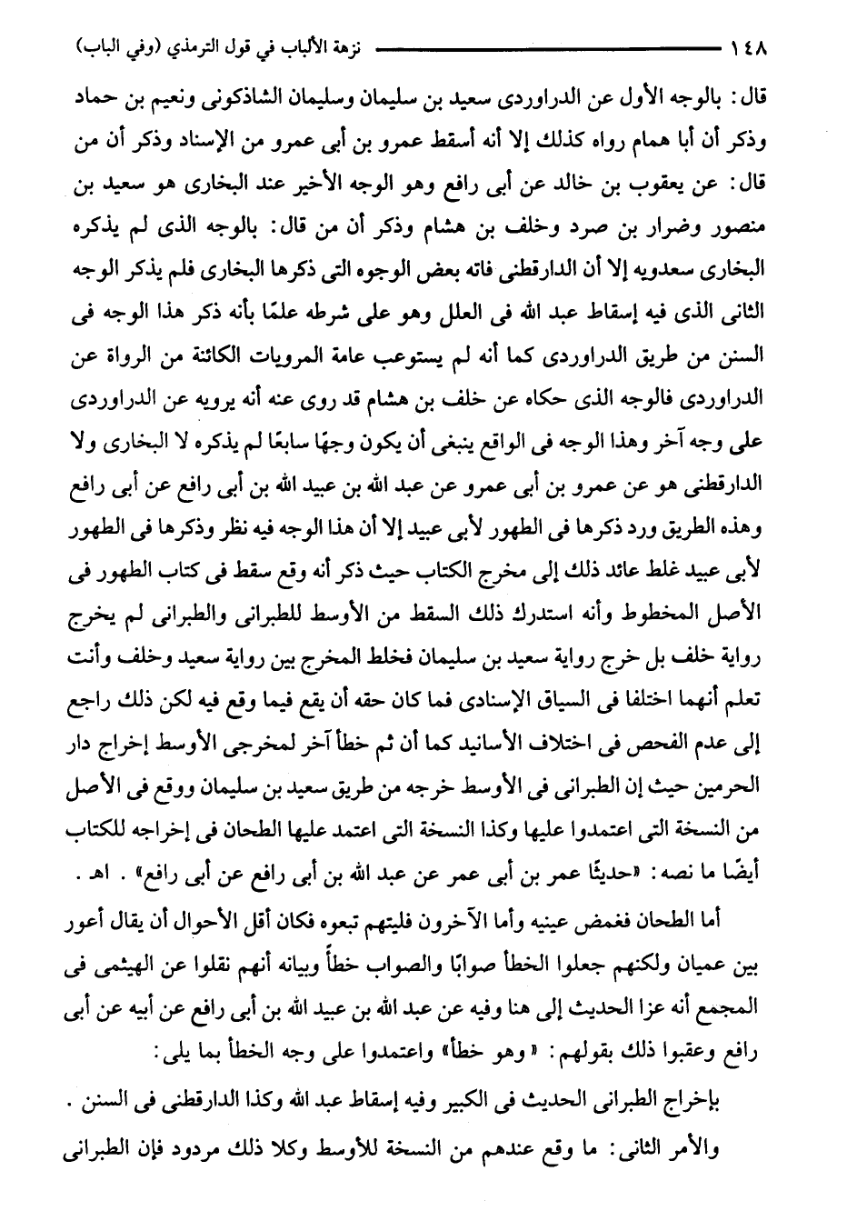 قال: بالوجه الأول عن الدراوردى سعيد بن سليمان وسليمان الشاذكونى ونعيم بن حماد وذكر أن أبا همام رواه كذلك إلا أنه أسقط عمرو بن أبى عمرو من الأسناد وذكر أن من قال: عن يعقوب بن خالد عن أبى رافع وهو الوجه الأخير عند البخاري هو سعيد بن منصور وضرار بن صرد وخلف بن هشام وذكر أن من قال: بالوجه الذى لم يذكره البخاري سعدويه إلا أن الدارقطني فاته بعض الوجوه التى ذكرها البخاري فلم يذكر الوجه الثانى الذى فيه إسقاط عبد الله في العلل وهو على شرطه علما بانه ذكر هذا الوجه في السنن من طريق الدراوردى كما أنه لم يستوعب عامة المرويات الكائنة من الرواة عن الدراوردى فالوجه الذى حكاه عن خلف بن هشام قد روى عنه أنه يرويه عن الدراوردى على وجه آخر وهذا الوجه في الواقع ينبغى أن يكون وجهًا سابعًا لم يذكره لا البخاري ولا الدارقطني هو عن عمرو بن أبى عمرو عن عبد الله بن عبيد الله بن أبى رافع عن أبى رافع وهذه الطريق ورد ذكرها في الطهور لأبى عبيد إلا أن هذا الوجه فيه نظر وذكرها في الطهور لأبى عبيد غلط عائد ذلك إلى مخرج الكتاب حيث ذكر أنه وقع سقط في كتاب الطهور في الأصل المخطوط وأنه استدرك ذلك السقط من الأوسط للطبراني والطبراني لم يخرج رواية خلف بل خرج رواية سعيد بن سليمان فخلط المخرج بين رواية سعيد وخلف وأنت تعلم أنهما اختلفا في السياق الإسنادى فما كان حقه أن يقع فيما وقع فيه لكن ذلك راجع إلى عدم الفحص في اختلاف الأسانيد كما أن ثم خطأ آخر لمخرجى الأوسط إخراج دار الحرمين حيث إن الطبراني في الأوسط خرجه من طريق سعيد بن سليمان ووقع في الأصل من النسخة التى اعتمدوا عليها وكذا النسخة التى اعتمد عليها الطحان في إخراجه للكتاب أيضًا ما نصه: "حديثًا عمر بن أبى عمر عن عبد الله بن أبى رافع عن أبى رافع". اهـ.