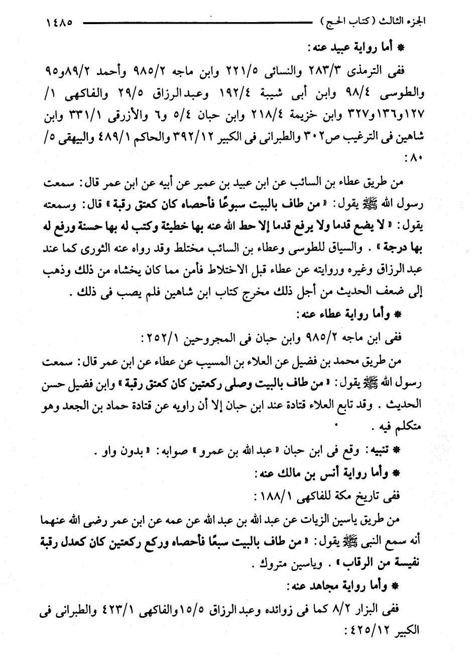 من طريق محمدبن فضيل عن العلاء بن المسيب عن عطاء عن ابن عمر قال: سمعت رسول الله - صلى الله عليه وسلم - يقول: "من طاف بالبيت وصلى ركعتين كان كعتق رقبة" وابن فضيل حسن الحديث. وقد تابع العلاء قتادة عند ابن حبان إلا أن راويه عن قتادة حماد بن الجعد وهو متكلم فيه.
