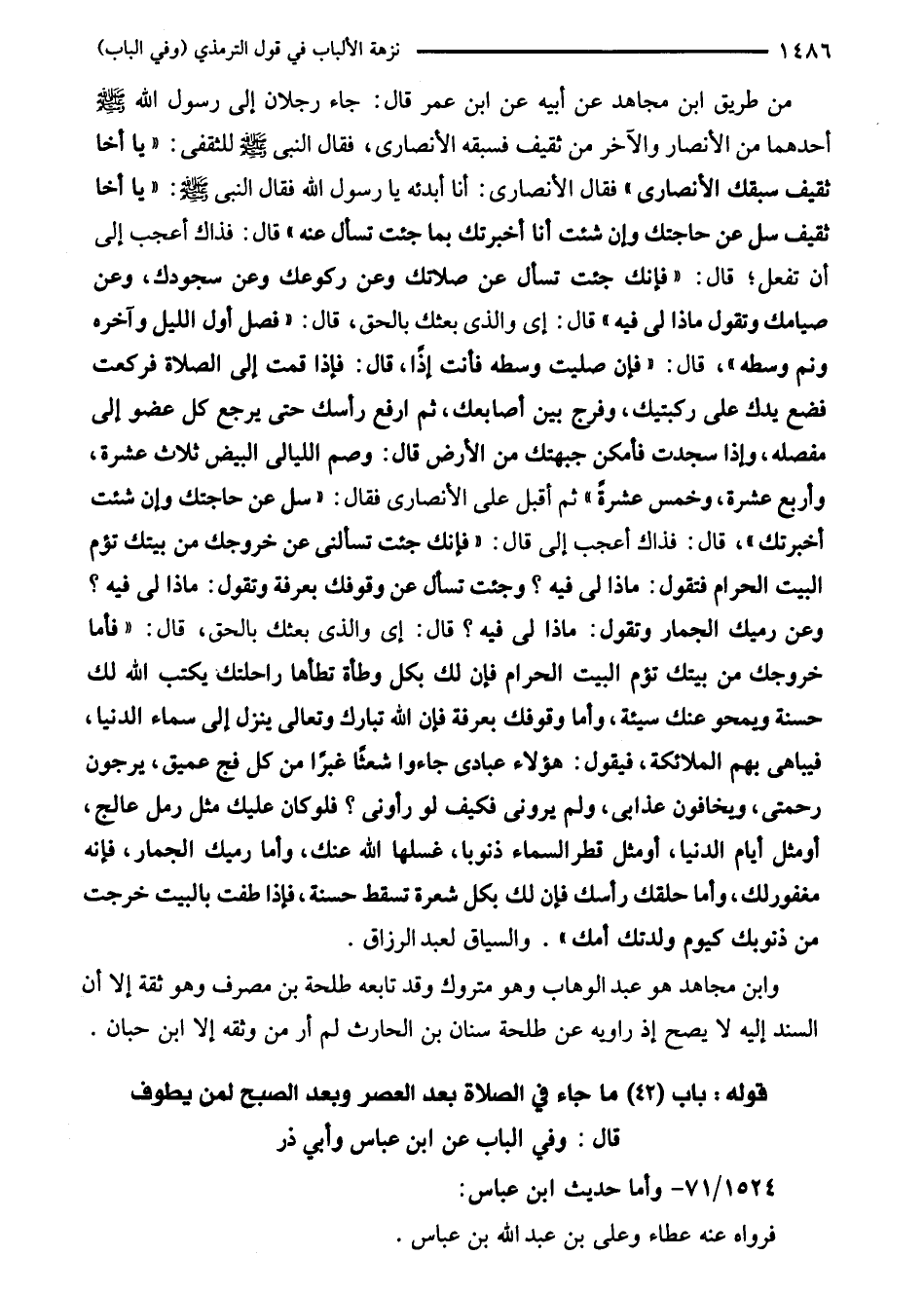 من طريق ابن مجاهد عن أبيه عن ابن عمر قال: جاء رجلان إلى رسول الله - صلى الله عليه وسلم - أحدهما من الأنصار والآخر من ثقيف فسبقه الأنصاري، فقال النبي - صلى الله عليه وسلم - للثقفى: "يا أخا ثقيف سبقك الأنصاري" فقال الأنصاري: أنا أبدئه يا رسول الله فقال النبي - صلى الله عليه وسلم -: "يا أخا ثقيف سل عن حاجتك كان شئت أنا أخبرتك بما جئت تسأل عنه" قال: فذاك أعجب إلى أن تفعل؛ قال: "فإنك جئت تسأل عن صلاتك وعن ركوعك وعن سجودك، وعن صيامك ونقول ماذا لى فيه" قال: إى والذى بعثك بالحق، قال: "فصل أول الليل وآخره ونم وسطه"، قال: "فإن صليت وسطه فأنت إذًا، قال: فإذا قمت الى الصلاة فركعت فضع يدك على ركبتيك، وفرج بين أصابعك، ثم ارفع رأسك حتى يرجع كل عضو الى مفصله، وإذا سجدت فأمكن جبهتك من الأرض قال: وصم الليالى البيض ثلاث عشرة، وأربع عشرة، وخمس عشرةً" ثم أقبل على الأنصاري فقال: "سل عن حاجتك وان شئت أخبرتك"، قال: فذاك أعجب إلى قال: "فإنك جئت تسألنى عن خروجك من بيتك تؤم الببت الحرام فتقول: ماذا لى فيه؟ وجئت تسأل عن وقوفك بعرفة وتقول: ماذا لى فيه؟ وعن رميك الجمار وتقول: ماذا لى فيه؟ قال: إى والذى بعثك بالحق، قال: "فأما خروجك من بيتك نؤم الببت الحرام فإن لك بكل وطأة تطأها راحلتك يكتب الله لك حسنة ويمحو عنك سيئة، وأما وقوفك بعرفة فإن الله تبارك وتعالى ينزل الى سماء الدنيا، فيباهى بهم الملائكة، فيفول: هؤلاء عبادى جاءوا شعثًا غبرًا من كل فج عميق، يرجون رحمتى، ويخافون عذابى، ولم يرونى فكيف لو رأونى؟ فلو كان عليك مثل رمل عالج، أو مثل أيام الدنيا، أو مثل قطر السماء ذنوبا، غسلها اله عنك، وأما رميك الجمار، فإنه مغفور لك، وأما حلقك رأسك فإن لك بكل شعرة تسقط حسنة، فإذا طفت بالبيت خرجت من ذنوبك كيوم ولدتك أمك". والسياق لعبد الرزاق.