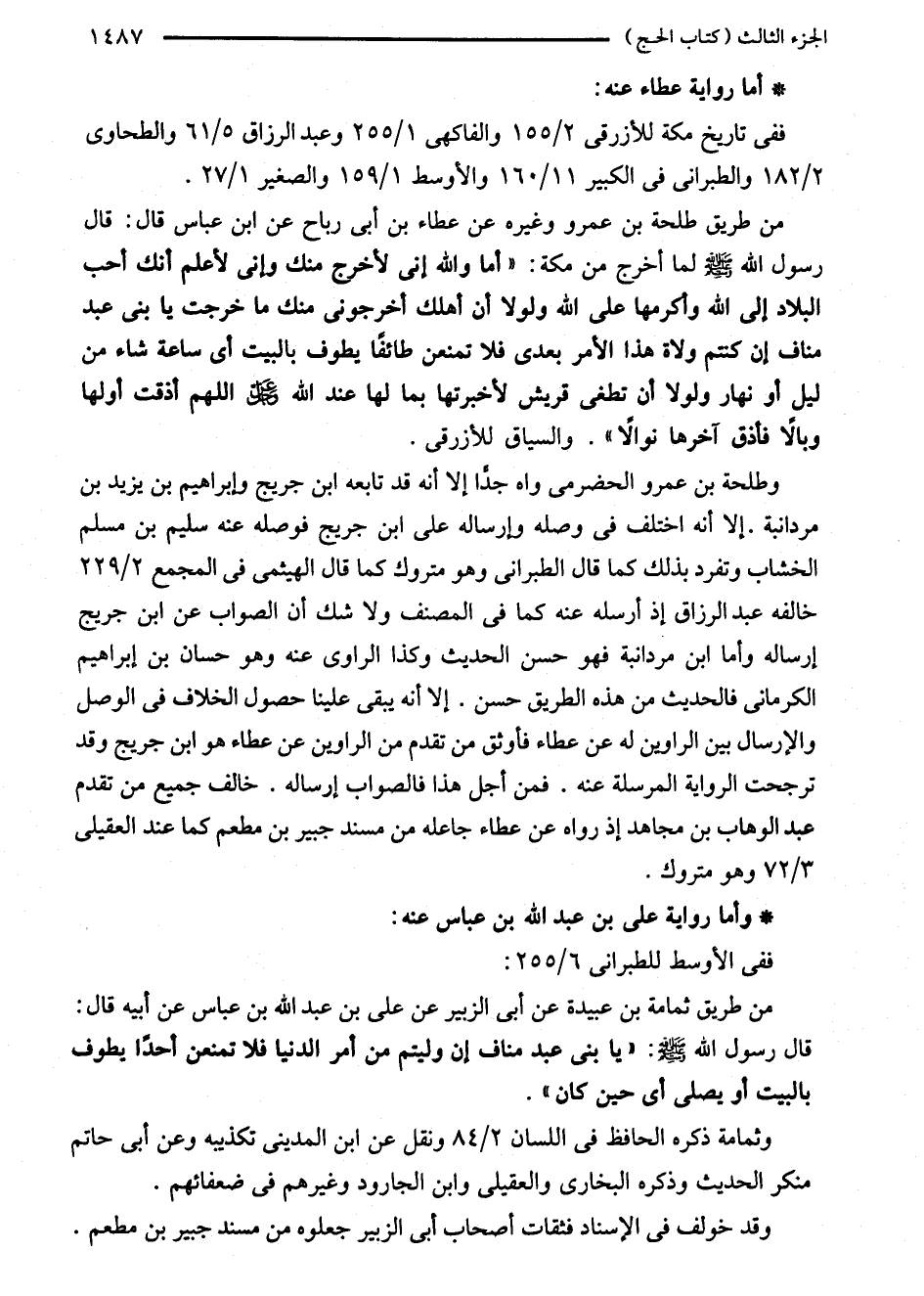 من طريق طلحة بن عمرو وغيره عن عطاء بن أبى رباح عن ابن عباس قال: قال رسول الله - صلى الله عليه وسلم - لما أخرج من مكة: "أما والله انى لأخرج منك وإنى لأعلم أنك أحب البلاد إلى الله وأكرمها على الله ولولا أن أهلك أخرجونى منك ما خرجت يا بنى عبد مناف إن كنتم ولاة هذا الأمر بعدى فلا تمنعن طائفًا بطوف بالببت أي ساعة شاء من ليل أو نهار ولولا أن تطغى قريش لأخبرتها بما لها عند الله - عز وجل - اللهم أذقت أولها وبالًا فأذق آخرها نوالًا". والسياق للأزرقى.