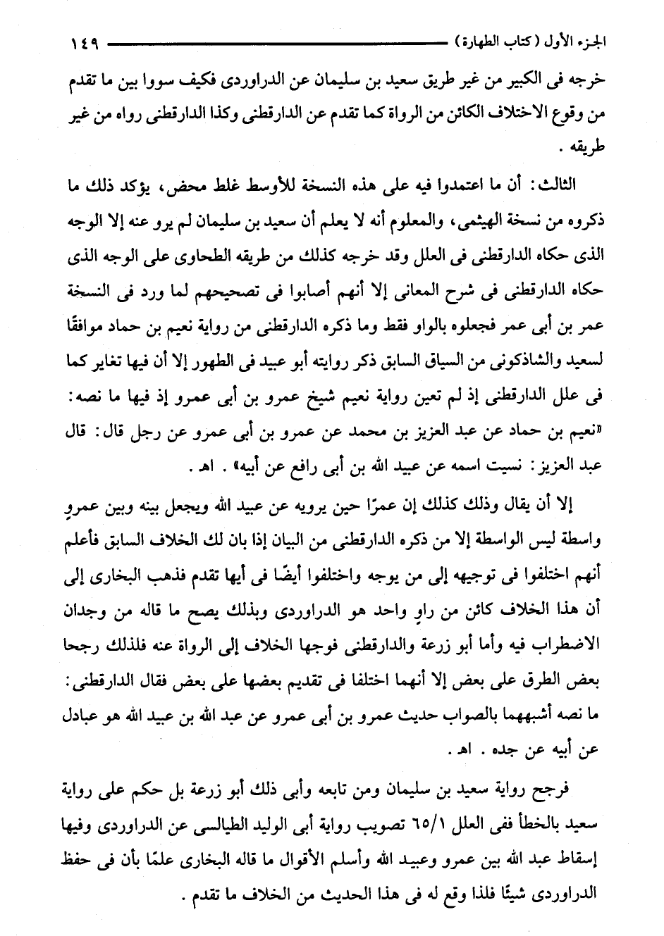 الثالث: أن ما اعتمدوا فيه على هذه النسخة للأوسط غلط محض، يؤكد ذلك ما ذكروه من نسخة الهيثمى، والمعلوم أنه لا يعلم أن سعيد بن سليمان لم يرو عنه إلا الوجه الذى حكاه الدارقطني في العلل وقد خرجه كذلك من طريقه الطحاوى على الوجه الذى حكاه الدارقطني في شرح المعانى إلا أنهم أصابوا في تصحيحهم لما ورد في النسخة عمر بن أبى عمر فجعلوه بالواو فقط وما ذكره الدارقطني من رواية نعيم بن حماد موافقًا لسعيد والشاذكونى من السياق السابق ذكر روايته أبو عبيد في الطهور إلا أن فيها تغاير كما في علل الدارقطني إذ لم تعين رواية نعيم شيخ عمرو بن أبى عمرو إذ فيها ما نصه: "نعيم بن حماد عن عبد العزيز بن محمد عن عمرو بن أبى عمرو عن رجل قال: قال عبد العزيز: نسيت اسمه عن عبيد الله بن أبى رافع عن أبيه". اهـ.