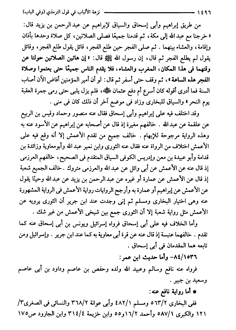 من طريق إبراهيم وأبى إسحاق والسياق لإبراهيم عن عبد الرحمن بن يزيد قال: "خرجنا مع عبد الله إلى مكة، ثم قدمنا جميعًا فصلى الصلاتين، كل صلاة وحدها بأذان وإقامة، والعشاء بينهما. ثم صلى الفجر حين طلع الفجر، قائل يقول طلع الفجر، وقائل يقول لم يطلع الفجر ثم قال، إن رسول الله - صلى الله عليه وسلم - قال: "إن هاتين الصلاتين حولتا عن وقتهما في هذا المكان، المغرب والعشاء، فلا يقدم الناس جميعًا حتى يعتموا وصلاة الفجر هده الساعة"، ثم وقف حتى أسفر ثم قال: لو أن أمير المؤمنين أفاض الآن أصاب السنة فما أدرى أقوله كان أسرع أم دفع عثمان - رضي الله عنه -، فلم يزل يلبى حتى رمى جمرة العقبة يوم النحر" والسياق للبخاري وزاد في موضع آخر أن ذلك كان في منى.