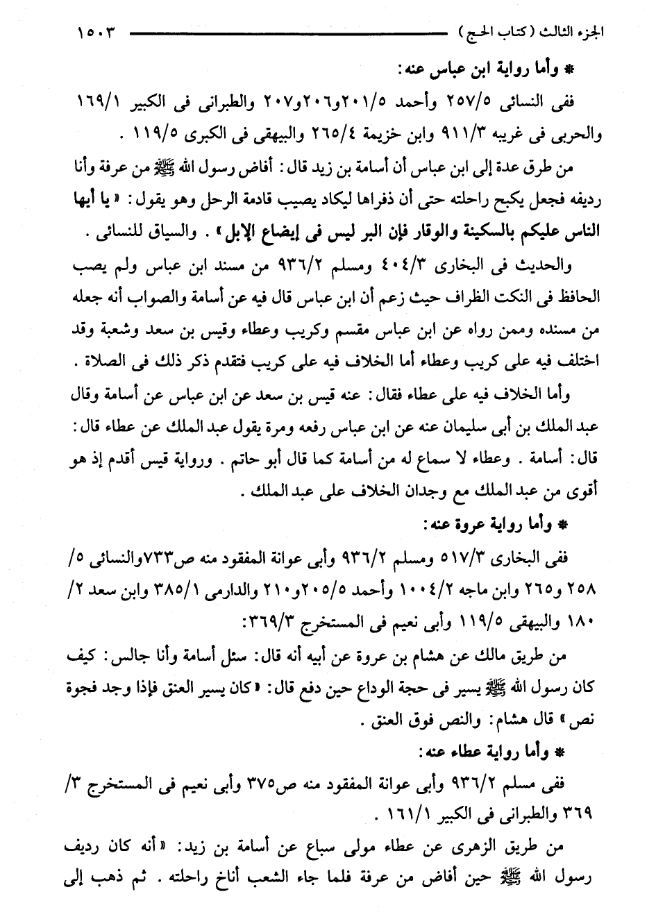 من طرق عدة إلى ابن عباس أن أسامة بن زيد قال: أفاض رسول الله - صلى الله عليه وسلم - رديفه فجعل يكبح راحلته حتى أن ذفراها ليكاد يصيب قادمة الرحل وهو يقول: "يا أيها الناس عليكم بالسكينة والوقار فإن البر ليس في إيضاع الابل". والسياق للنسائي.