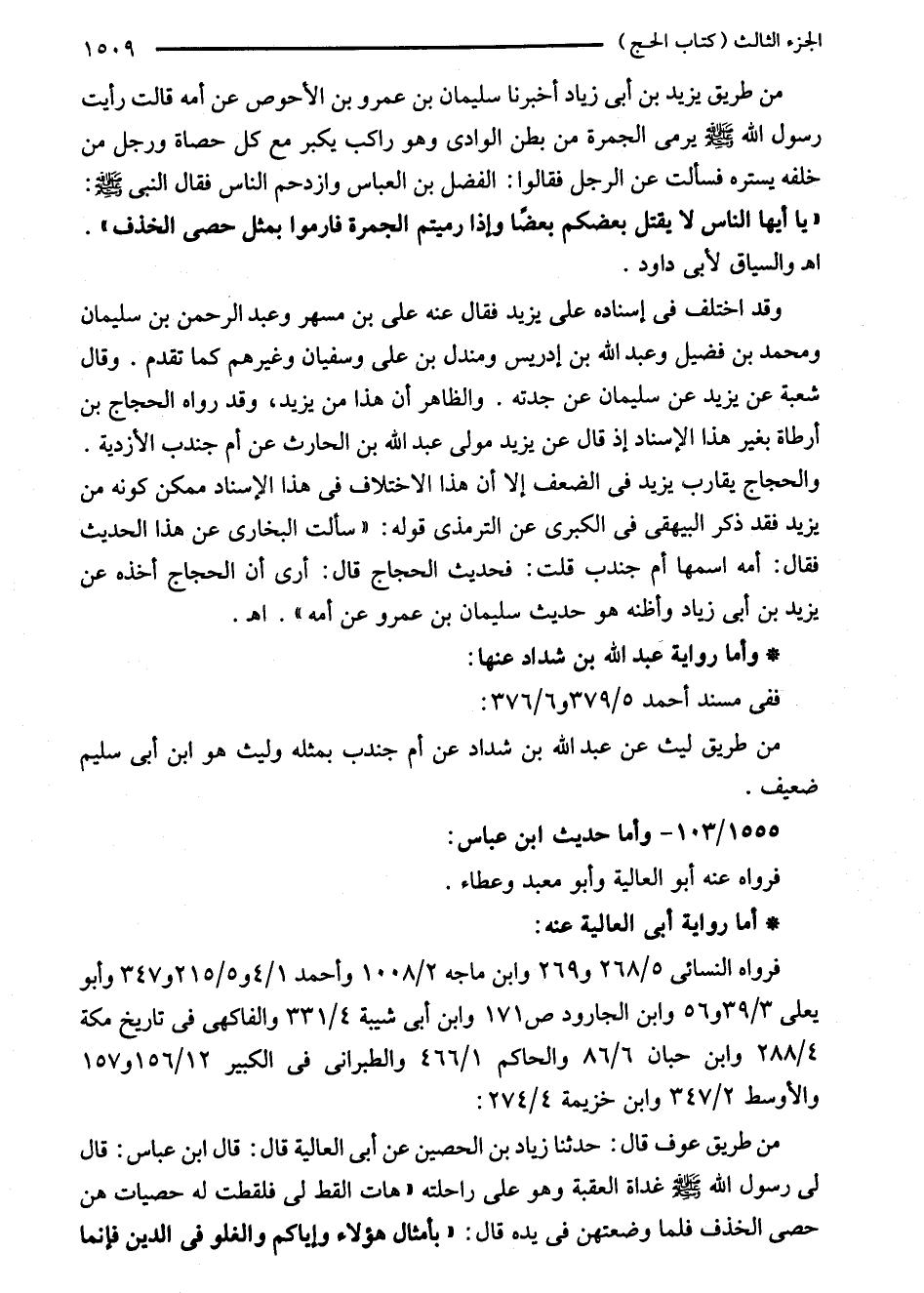 من طريق عوف قال: حدثنا زياد بن الحصين عن أبى العالية قال: قال ابن عباس: قال لى رسول الله - صلى الله عليه وسلم - غداة العقبة وهو على راحلته "هات القط لى فلقطت له حصيات هن حصى الخذف فلما وضعتهن في يده قال: "بأمثال هؤلاء وإياكم والغلو في الدين فإنما