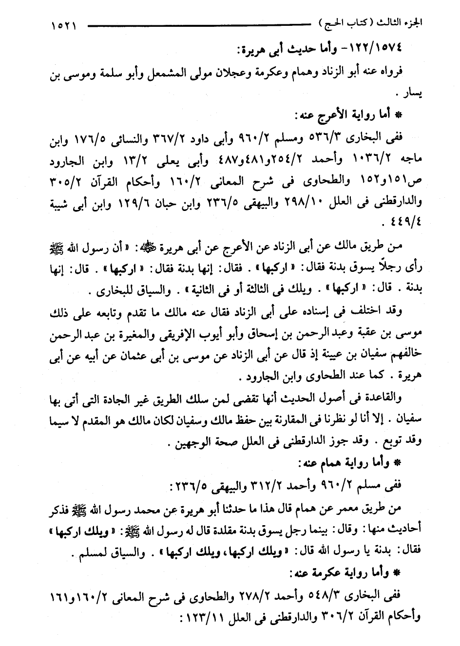 من طريق مالك عن أبى الزناد عن الأعرج عن أبى هريرة - رضي الله عنه -: "أن رسول الله - صلى الله عليه وسلم - رأى رجلاً يسوق بدنة فقال: "اركبها". فقال: إنها بدنة فقال: "اركبها". قال: إنها بدنة. قال: "اركبها". ويلك في الثالثة أو في الثانية". والسياق للبخاري.
