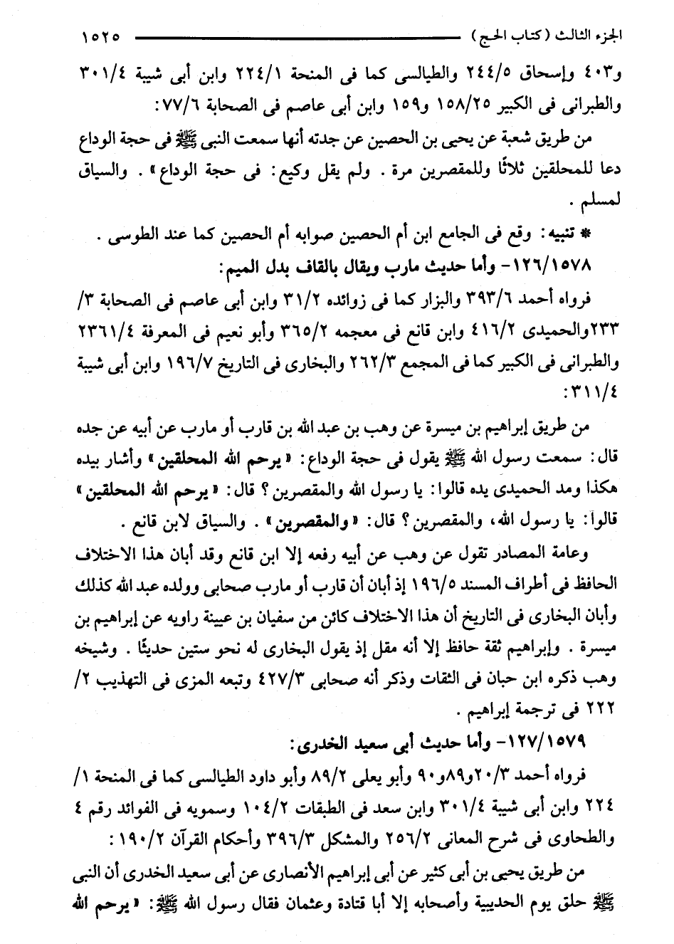 من طريق يحيى بن أبى كثير عن أبى إبراهيم الأنصاري عن أبى سعيد الخدرى أن النبي - صلى الله عليه وسلم - حلق يوم الحدببة وأصحابه إلا أبا قتادة وعثمان فقال رسول الله - صلى الله عليه وسلم -: "يرحم الله