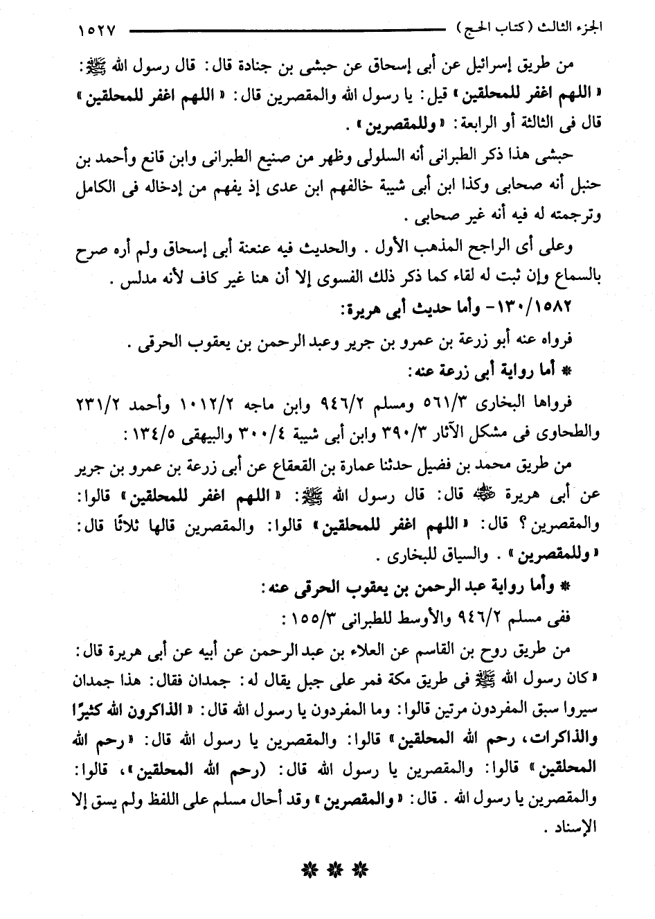 من طريق إسرائيل عن أبى إسحاق عن حبشى بن جنادة قال: قال رسول الله - صلى الله عليه وسلم -: "اللهم اغفر للمحلقين" قيل: يا رسول الله والمقصرين قال: "اللهم اغفر للمحلقين" قال في الثالثة أو الرابعة: "وللمقصرين".