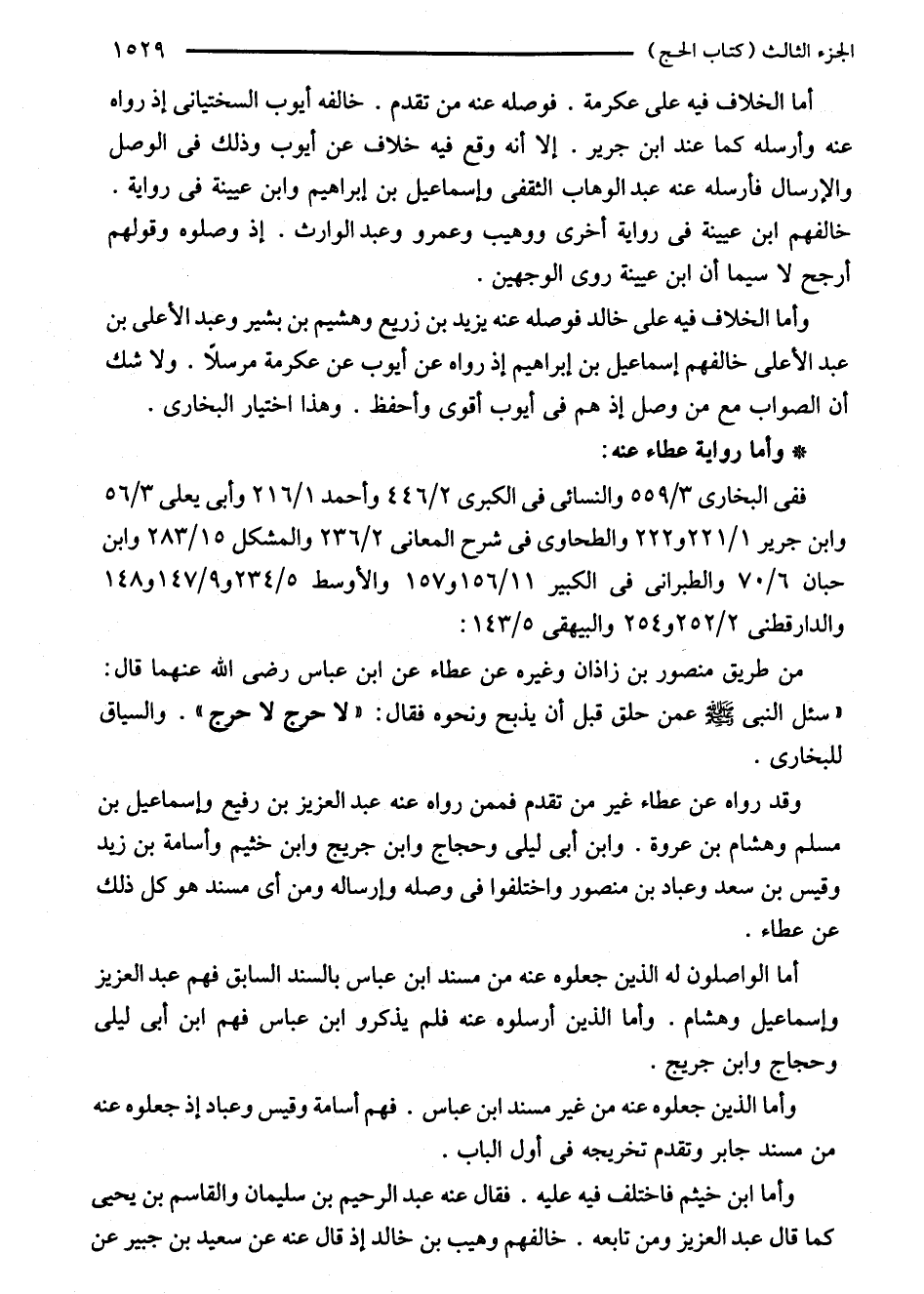 من طريق منصور بن زاذان وغيره عن عطاء عن ابن عباس رضى الله عنهما قال: "سئل النبي - صلى الله عليه وسلم - عمن حلق قبل أن يذبح ونحوه فقال: "لا حرج لا حرج". والسياق للبخاري.