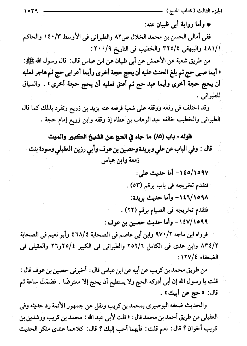 من طريق شعبة عن الأعمش عن أبى ظبيان عن ابن عباس قال: قال رسول الله - صلى الله عليه وسلم -: "أيما صبي حج ثم بلغ الحنث عليه أن بحج حجة أخرى وأيما أعرابى حج ثم هاجر فعليه أن يحج حجة أخرى وأيما عبد حج ثم أعتق فعليه أن يحج حجة أخرى". والسياق للطبراني.