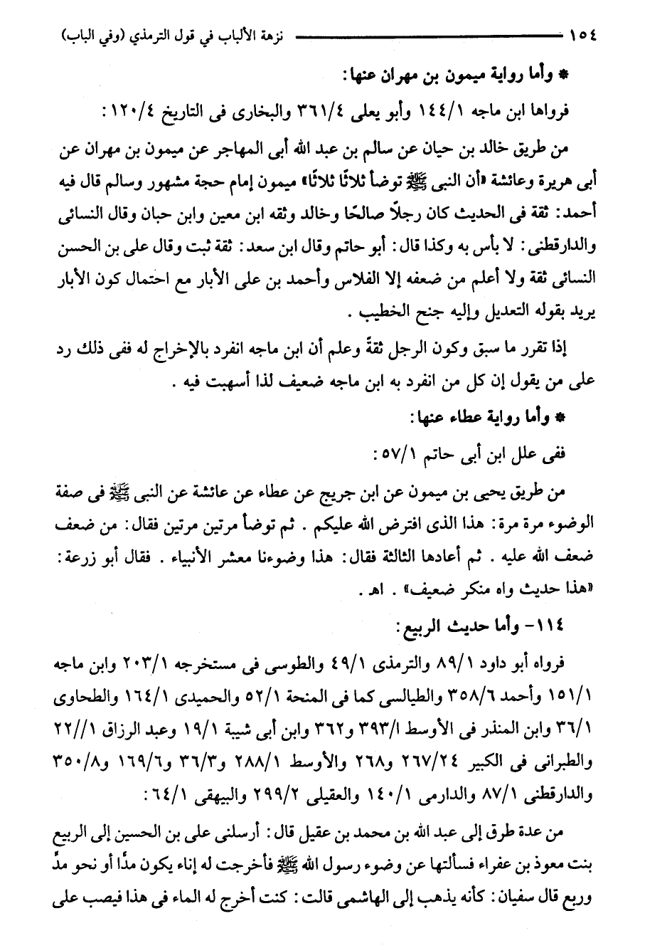 من عدة طرق إلى عبد الله بن محمد بن عقيل قال: أرسلنى على بن الحسين إلى الربيع بنت معوذ بن عفراء فسألتها عن وضوء رسول الله - صلى الله عليه وسلم - فأخرجت له إناء يكون مدًّا أو نحو مدٍّ وربع قال سفيان: كأنه يذهب إلى الهاشمى قالت: كنت أخرج له الماء في هذا فيصب على