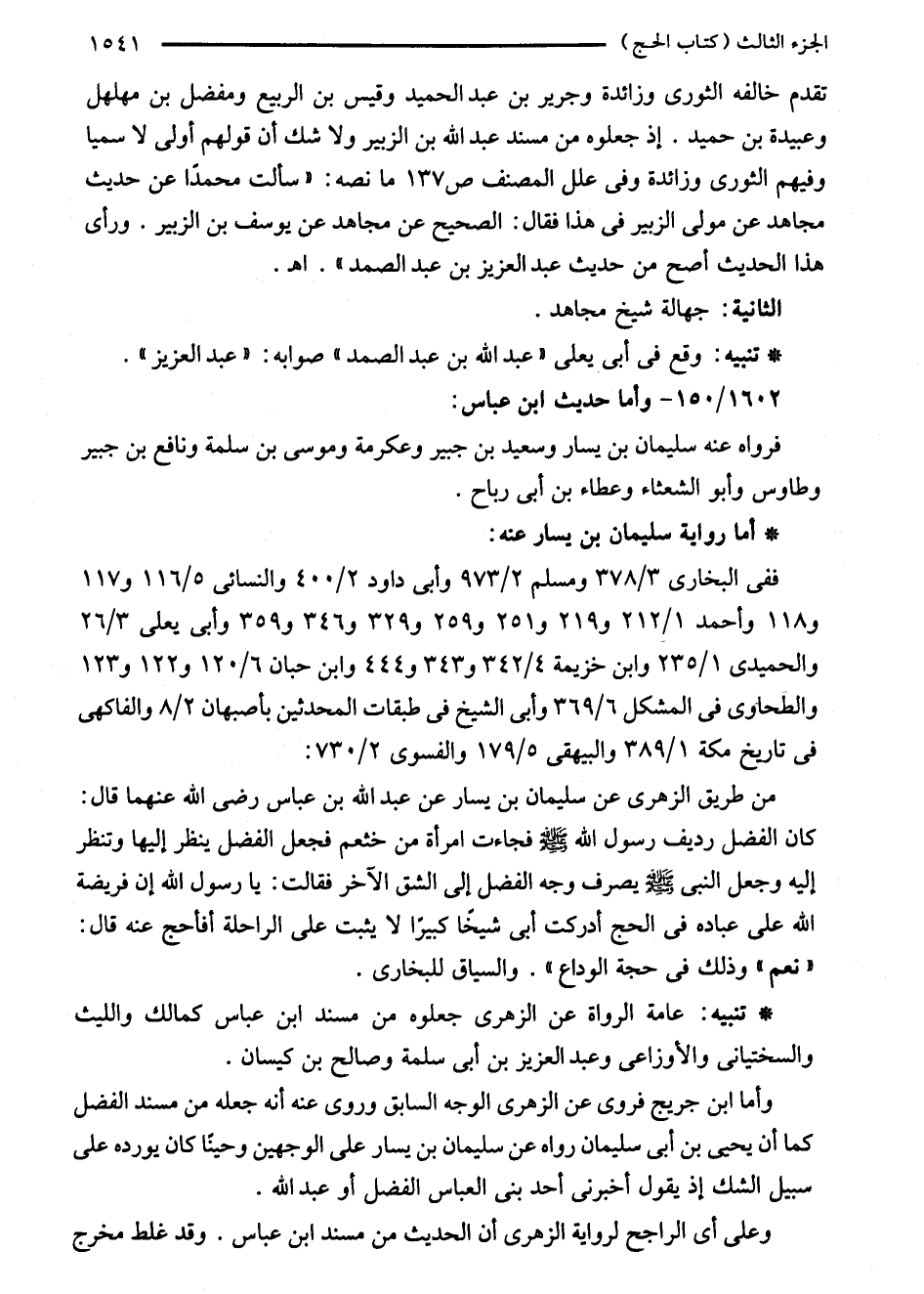 وأما ابن جريج فروى عن الزهرى الوجه السابق وروى عنه أنه جعله من مسند الفضل كما أن يحيى بن أبى سليمان رواه عن سليمان بن يسار على الوجهين وحينًا كان يورده على سبيل الشك إذ يقول أخبرنى أحد بنى العباس الفضل أو عبد الله.