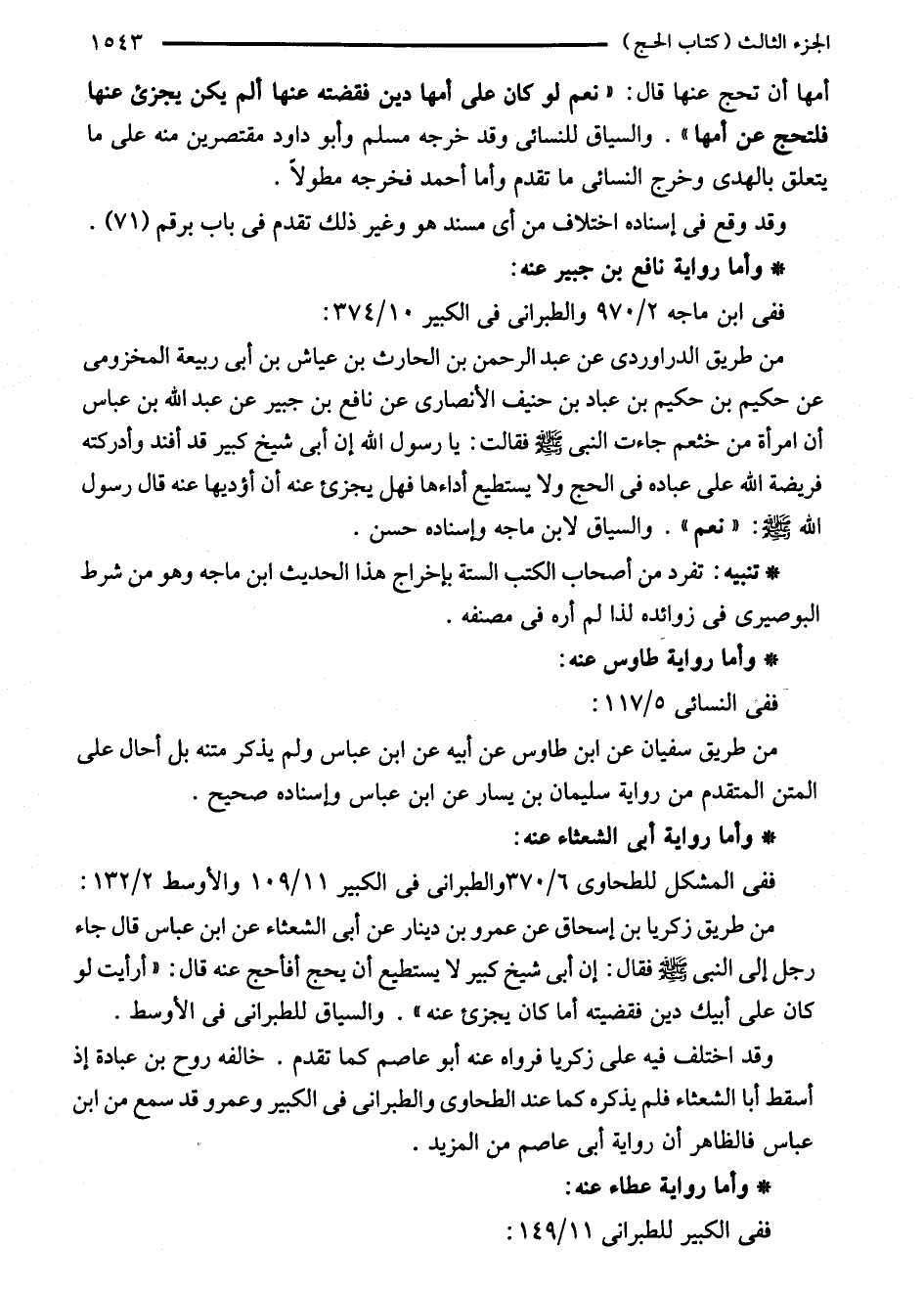 من طريق زكريا بن إسحاق عن عمرو بن دينار عن أبى الشعثاء عن ابن عباس قال جاء رجل إلى النبي - صلى الله عليه وسلم - فقال: إن أبى شيخ كبير لا يستطيع أن يحج أفأحج عنه قال: "أرأيت لو كان على أبيك دين فقضيته أما كان يجزئ عنه". والسياق للطبراني في الأوسط.