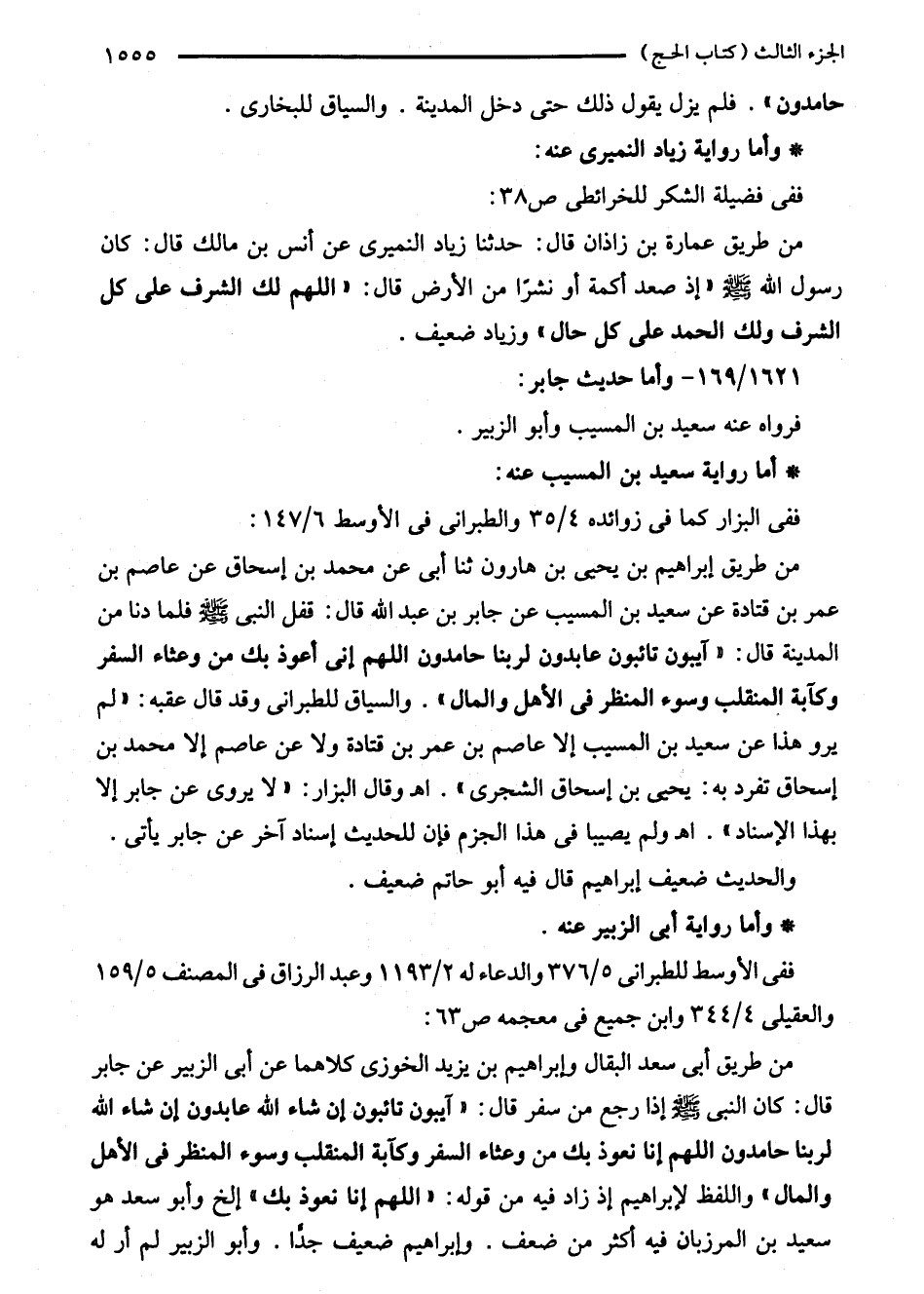 من طريق إبراهيم بن يحيى بن هارون ثنا أبى عن محمد بن إسحاق عن عاصم بن عمر بن قتادة عن سعيد بن المسيب عن جابر بن عبد الله قال: قفل النبي - صلى الله عليه وسلم - فلما دنا من المدينة قال: "آيبون تائبون عابدون لربنا حامدون اللهم انى أعوذ بك من وعثاء السفر وكآبة المنقلب وسوء المنظر في الأهل والمال". والسياق للطبراني وقد قال عقبه: "لم يرو هذا عن سعيد بن المسيب إلا عاصم بن عمر بن قتادة ولا عن عاصم إلا محمد بن إسحاق تفرد به: يحيى بن إسحاق الشجرى". اهـ وقال البزار: "لا يروى عن جابر إلا بهذا الإسناد". اهـ ولم يصيبا في هذا الجزم فإن للحديث إسناد آخر عن جابر يأتى. والحديث ضعيف إبراهيم قال فيه أبو حاتم ضعيف.