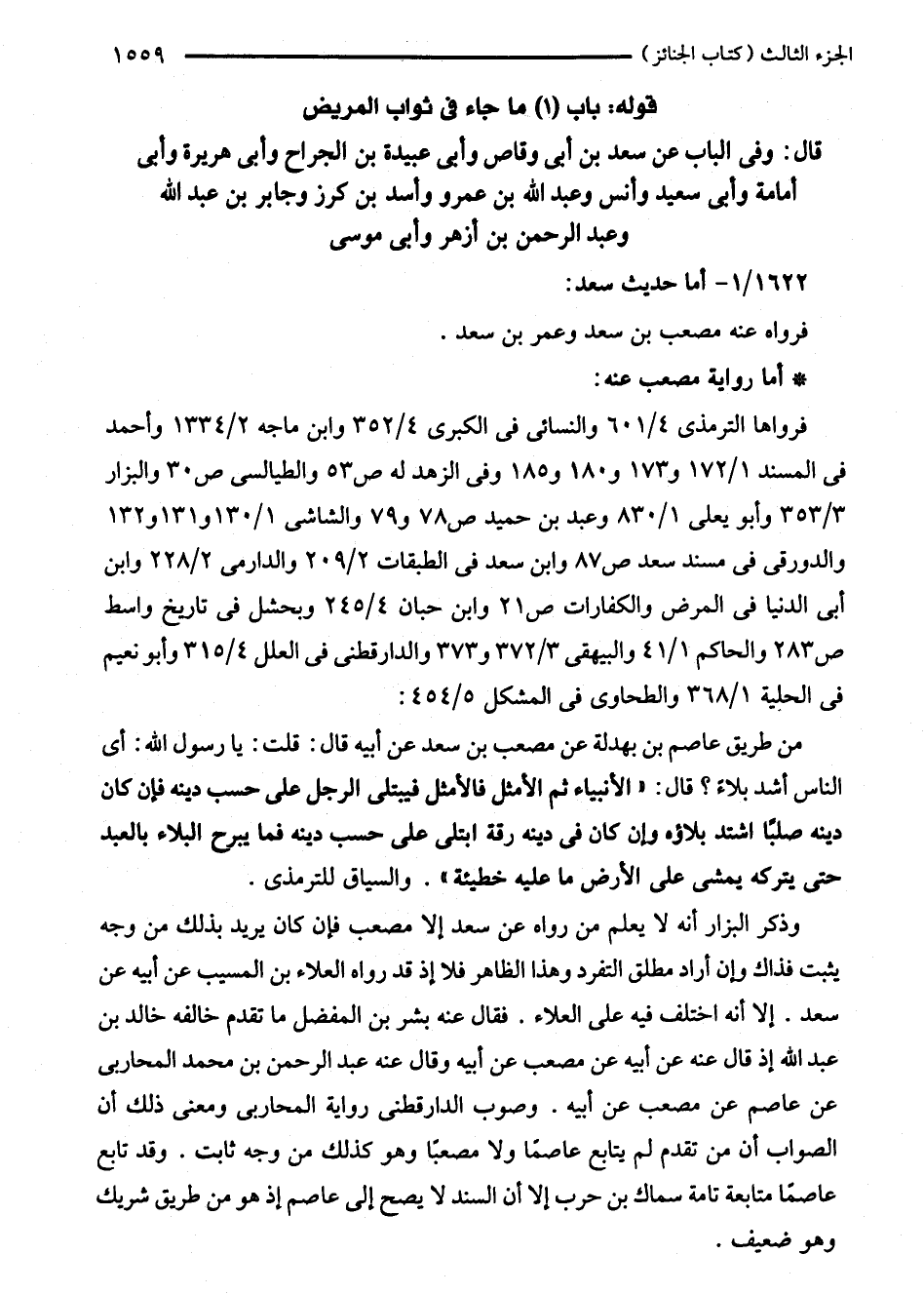 فرواها الترمذي 4/ 601 والنسائي في الكبرى 4/ 352 وابن ماجه 2/ 1334 وأحمد في المسند 1/ 172 و 173 و 180 و 185 وفى الزهد له ص 53 والطيالسى ص30 والبزار 3/ 353 وأبو يعلى 1/ 830 وعبد بن حميد ص 78 و 79 والشاشى 1/ 130 و 131 و 132 والدورقى في مسند سعد ص 87 وابن سعد في الطبقات 2/ 209 والدارمي 2/ 228 وابن أبى الدنيا في المرض والكفارات ص 21 وابن حبان 4/ 245 وبحشل في تاريخ واسط ص 283 والحاكم 1/ 41 والبيهقي 3/ 372 و 373 والدارقطني في العلل 4/ 315 وأبو نعيم في الحلية 1/ 368 والطحاوى في المشكل 5/ 454: