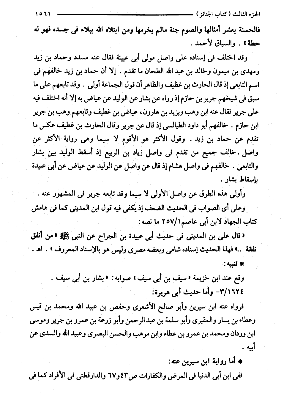 وقد اختلف في إسناده على واصل مولى أبى عيينة فقال عنه مسدد وحماد بن زيد ومهدى بن ميمون وخالد بن عبد الله الطحان ما تقدم. إلا أن حماد بن زيد خالفهم في اسم التابعى إذ قال الحارث بن غظيف والظاهر أن قول الجماعة أولى. وقد تابعهم على ما سبق في شيخهم جرير بن حازم إذ رواه عن بشار عن الوليد عن عياض به إلا أنه اختلف فيه على جرير فقال عنه ابن وهب ويزيد بن هارون، عياض بن غطيف وتابعهم وهب بن جرير ابن حازم. خالفهم أبو داود الطيالسى إذ قال عن جرير وقال الحارث بن غطيف عكس ما تقدم عن حماد بن زيد. وقول الأكثر هو الأقوم لا سيما وهى رواية الأكثر عن واصل. خالف جميع من تقدم في واصل زياد بن الربيع إذ أسقط الوليد بين بشار والتابعى. خالفهم في واصل هشام إذ قال عن وأصل عن الوليد عن عياض عن أبى عبيدة بإسقاط بشار.
