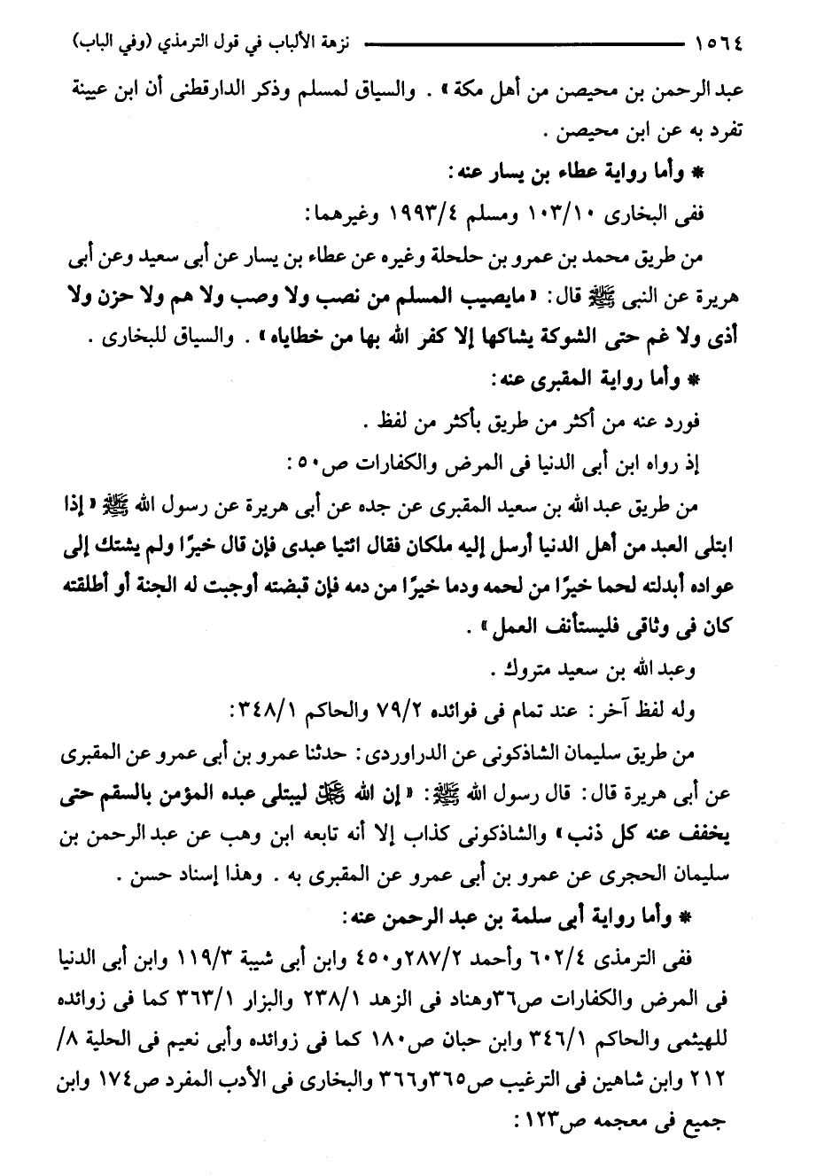 من طريق سليمان الشاذكونى عن الدراوردى: حدثنا عمرو بن أبى عمرو عن المقبرى عن أبى هريرة قال: قال رسول الله - صلى الله عليه وسلم -: "إن الله - عز وجل - ليبتلى عبده المؤمن بالسقم حتى يخفف عنه كل ذنب" والشاذكونى كذاب إلا أنه تابعه ابن وهب عن عبد الرحمن بن سليمان الحجرى عن عمرو بن أبى عمرو عن المقبرى به. وهذا إسناد حسن.