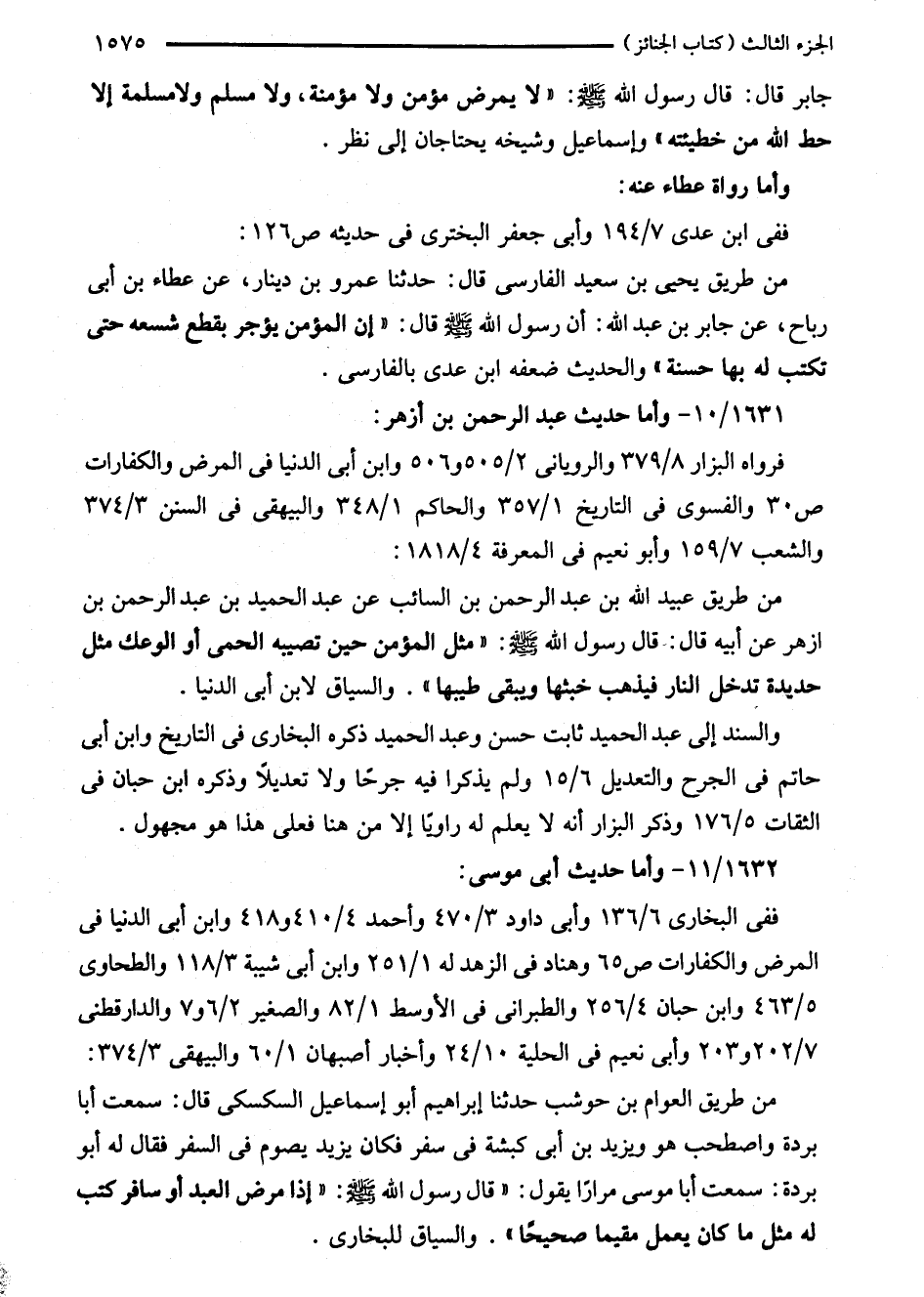 فرواه البزار 8/ 379 والرويانى 2/ 505 و 506 وابن أبى الدنيا في المرض والكفارات ص 30 والفسوى في التاريخ 1/ 357 والحاكم 1/ 348 والبيهقي في السنن 3/ 374 والشعب 7/ 159 وأبو نعيم في المعرفة 4/ 1818: