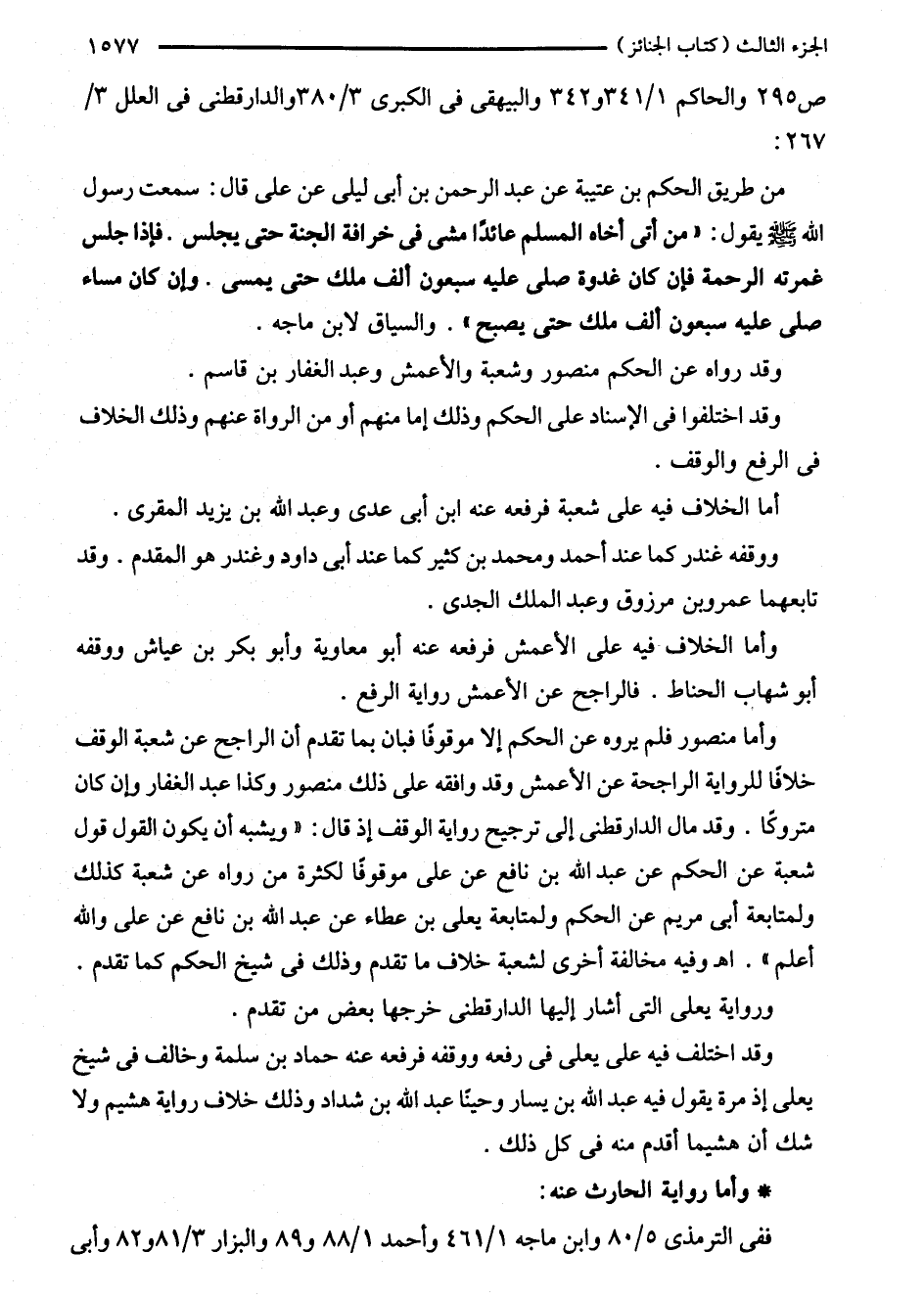 من طريق الحكم بن عتيبة عن عبد الرحمن بن أبى ليلى عن على قال: سمعت رسول الله - صلى الله عليه وسلم - يقول: "من أتى أخاه المسلم عائدًا مشى في خرافة الجنة حتى يجلس. فإذا جلس غمرته الرحمة فإن كان غدوة صلى عليه سبعون ألف ملك حتى يمسى. وإن كان مساء صلى عليه سبعون ألف ملك حتى يصبح". والسياق لابن ماجه.