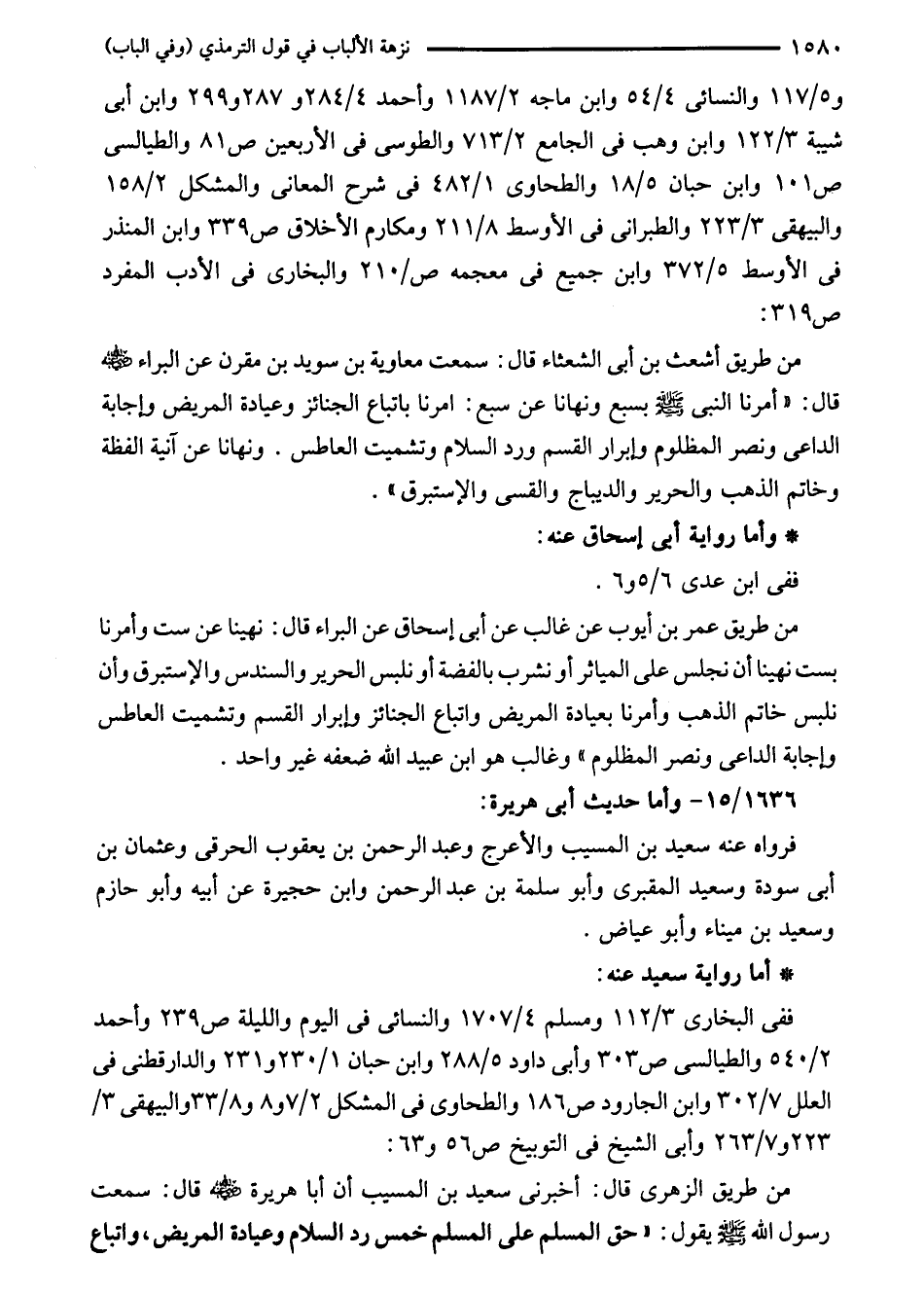 من طريق أشعث بن أبى الشعثاء قال: سمعت معاوية بن سويد بن مقرن عن البراء - رضي الله عنه - قال: "أمرنا النبي - صلى الله عليه وسلم - بسبع ونهانا عن سبع: أمرنا باتباع الجنائز وعيادة المريض وإجابة الداعى ونصر المظلوم وإبرار القسم ورد السلام وتشميت العاطس. ونهانا عن آنية الفظة وخاتم الذهب والحرير والديباج والقسى والإستبرق".