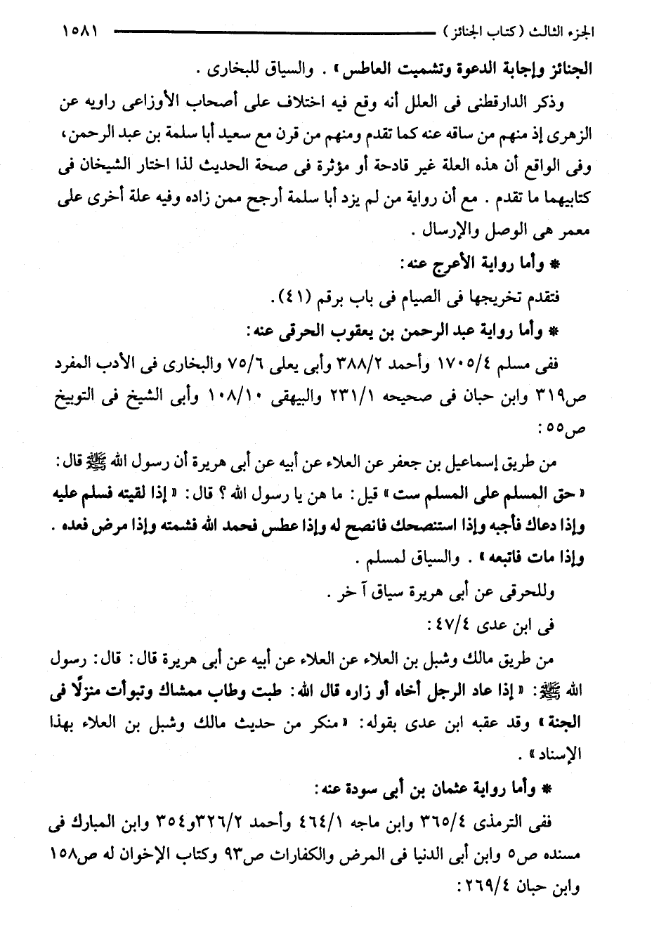 من طريق إسماعيل بن جعفر عن العلاء عن أبيه عن أبى هريرة أن رسول الله - صلى الله عليه وسلم - قال: "حق المسلم على المسلم ست" قيل: ما هن يا رسول الله؟ قال: "إذا لقيته فسلم عليه وإذا دعاك فأجبه وإذا استنصحك فانصح له وإذا عطس فحمد الله فشمته وإذا مرض فعده. وإذا مات فاتبعه". والسياق لمسلم.