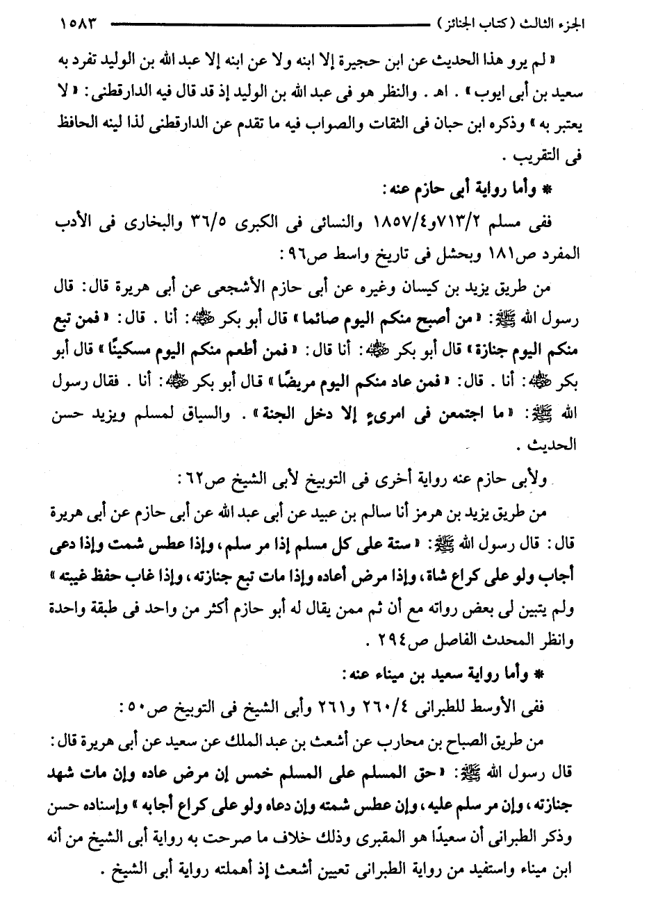 من طريق يزيد بن هرمز أنا سالم بن عبيد عن أبى عبد الله عن أبى حازم عن أبى هريرة قال: قال رسول الله - صلى الله عليه وسلم -: "ستة على كل مسلم إذا مر سلم، وإذا عطس شمت وإذا دعى أجاب ولو على كراع شاة، وإذا مرض أعاده وإذا مات تبع جنارته، وإذا غاب حفظ غيبته" ولم يتبين لى بعض رواته مع أن ثم ممن يقال له أبو حازم أكثر من واحد في طبقة احدة وانظر المحدث الفاصل ص 294.