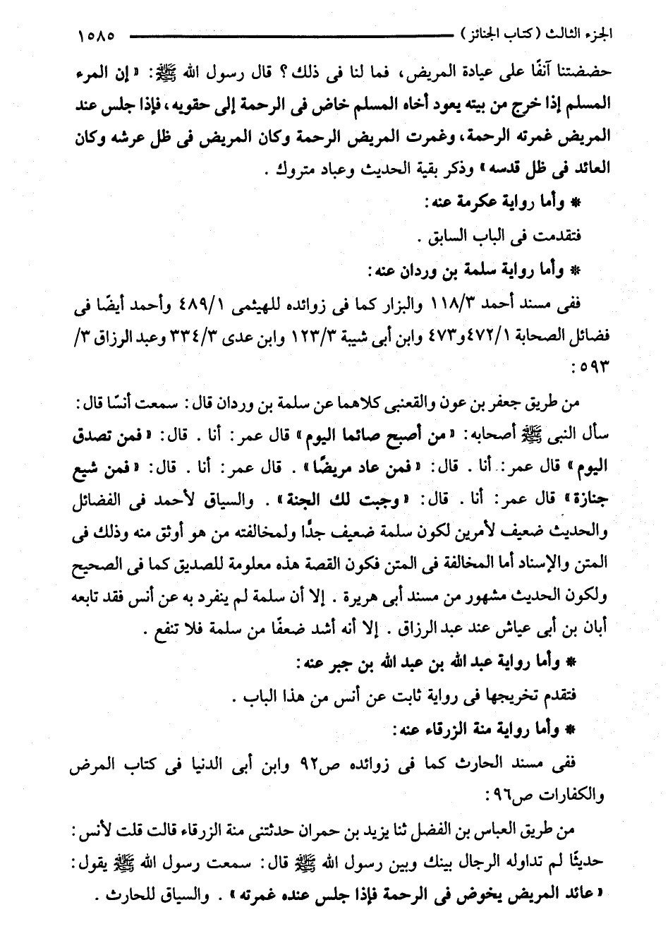 من طريق العباس بن الفضل ثنا يزيد بن حمران حدثتنى منة الزرقاء قالت قلت لأنس: حديثاً لم تداوله الرجال بينك وبين رسول الله - صلى الله عليه وسلم - قال: سمعت رسول الله - صلى الله عليه وسلم - يقول: "عائد المريض يخوض في الرحمة فإذا جلس عنده غمرته،. والسياق للحارث.