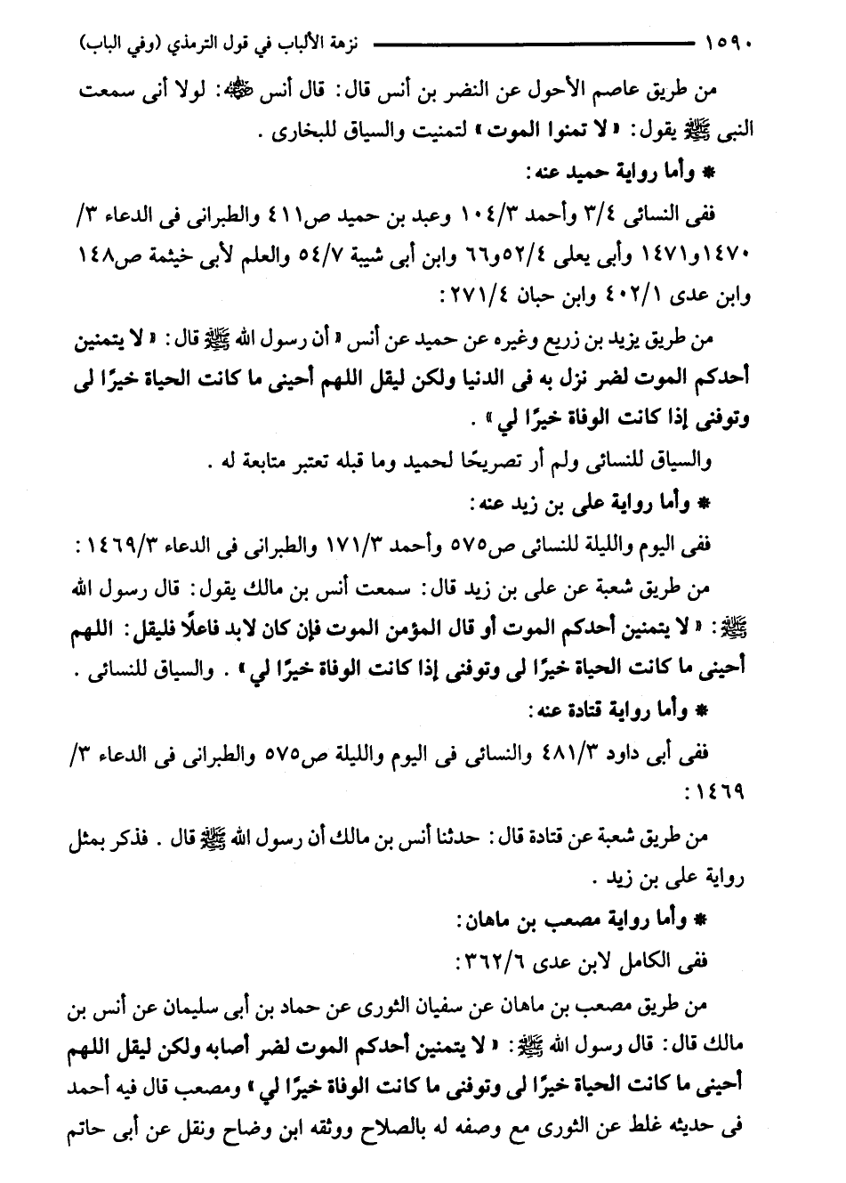 من طريق يزيد بن زريع وغيره عن حميد عن أنساً أن رسول الله - صلى الله عليه وسلم - قال: "لا يتمنين أحدكم الموت لضر نزل به في الدنيا ولكن ليقل اللهم أحينى ما كانت الحياة خيرًا لى وتوفنى إذا كانت الوفاة خيرًا لي".