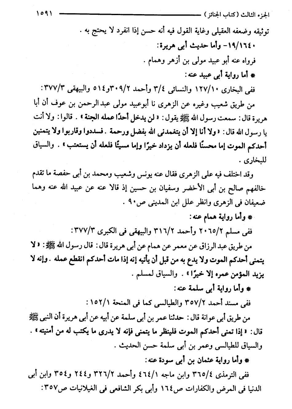 من طريق شعيب وغيره عن الزهرى نا أبو عبيد مولى عبد الرحمن بن عوف أن أبا هريرة قال: سمعت رسول الله - صلى الله عليه وسلم - يقول: "لن يدخل أحدًا عمله الجنة". قالوا: ولا أنت يا رسول الله قال: "ولا أنا إلا أن يتغمدنى الله بفضل ورحمة. فسددوا وقاربوا ولا يتمنين أحدكم الموت إما محسنًا فلعله أن يزداد خيرًا وإما مسيئًا فلعله أن يستعتب". والسياق للبخاري.