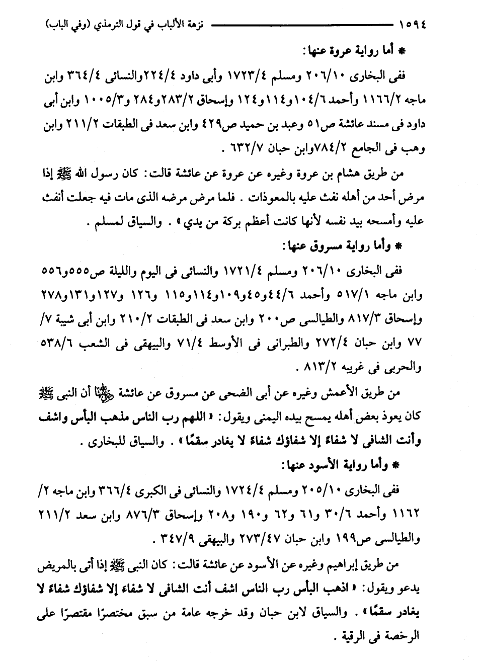 من طريق إبراهيم وغيره عن الأسود عن عائشة قالت: كان النبي - صلى الله عليه وسلم - إذا أتى بالمريض يدعو ويقول: "اذهب البأس رب الناس اشف أنت الشافى لا شفاءً إلا شفاؤك شفاءً لا يغادر سقمًا". والسياق لابن حبان وقد خرجه عامة من سبق مختصرًا مقتصرًا على الرخصة في الرقية.