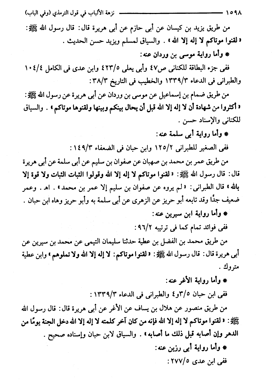 من طريق ضمام بن إسماعيل عن موسى بن وردان عن أبى هريرة عن رسول الله - صلى الله عليه وسلم -: "أكثروا من شهادة أن لا إله إلا الله قبل أن يحال ببنكم وبينها ولقنوها موتاكم". والسياق للكنانى والإسناد حسن.