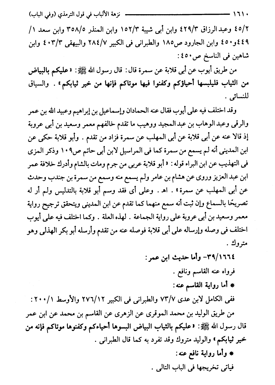 من طريق الوليد بن محمد الموقرى عن الزهرى عن القاسم بن محمد عن ابن عمر قال رسول الله - صلى الله عليه وسلم -: "عليكم بالثياب البياض البسوها أحياءكم وكفنوها موتاكم فإنه من خير ثيابكم" والوليد متروك وقد تفرد به كما قال الطبراني.