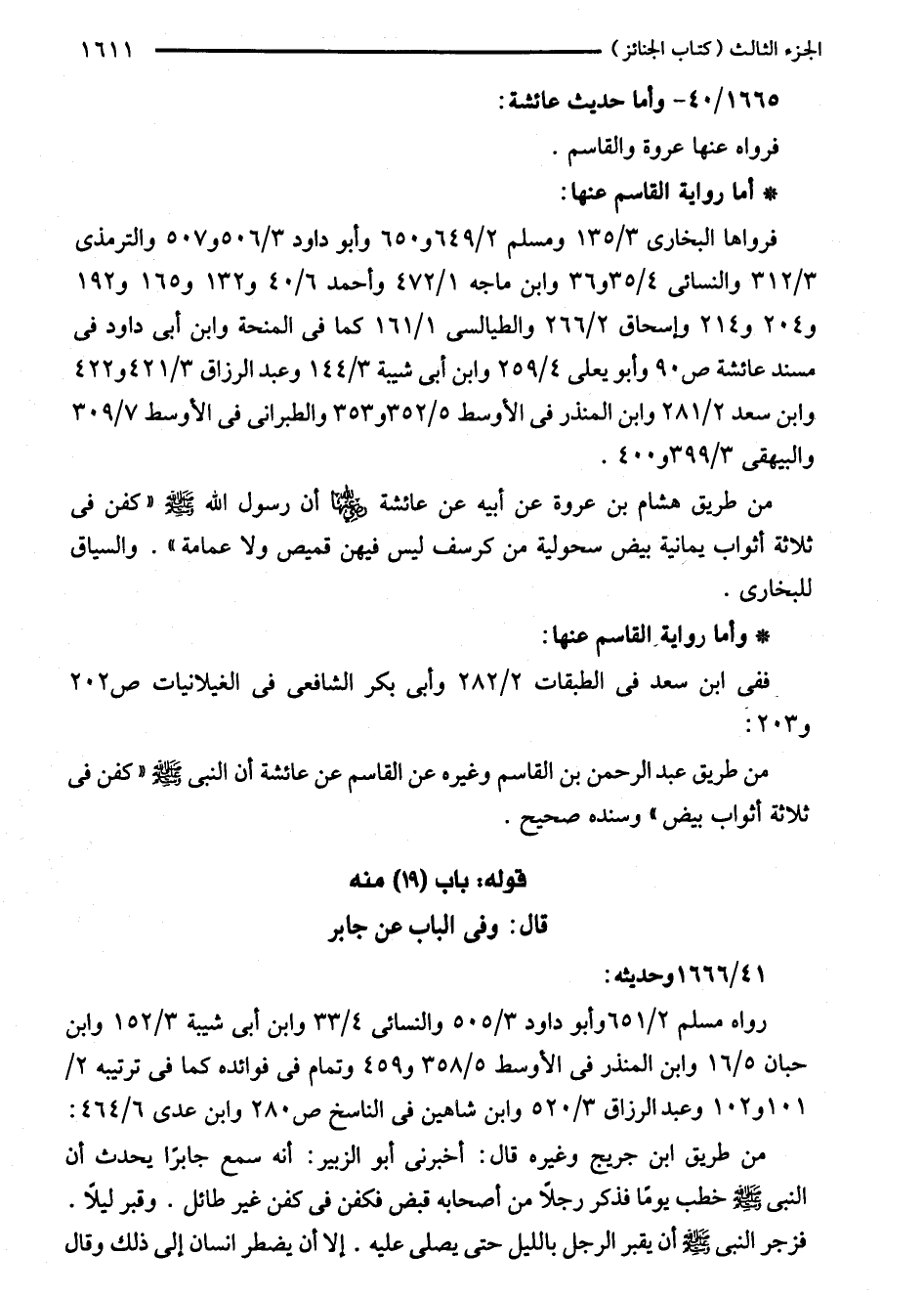 من طريق عبد الرحمن بن القاسم وغيره عن القاسم عن عائشة أن النبي - صلى الله عليه وسلم - "كفن في ثلاثة أثواب بيض" وسنده صحيح.