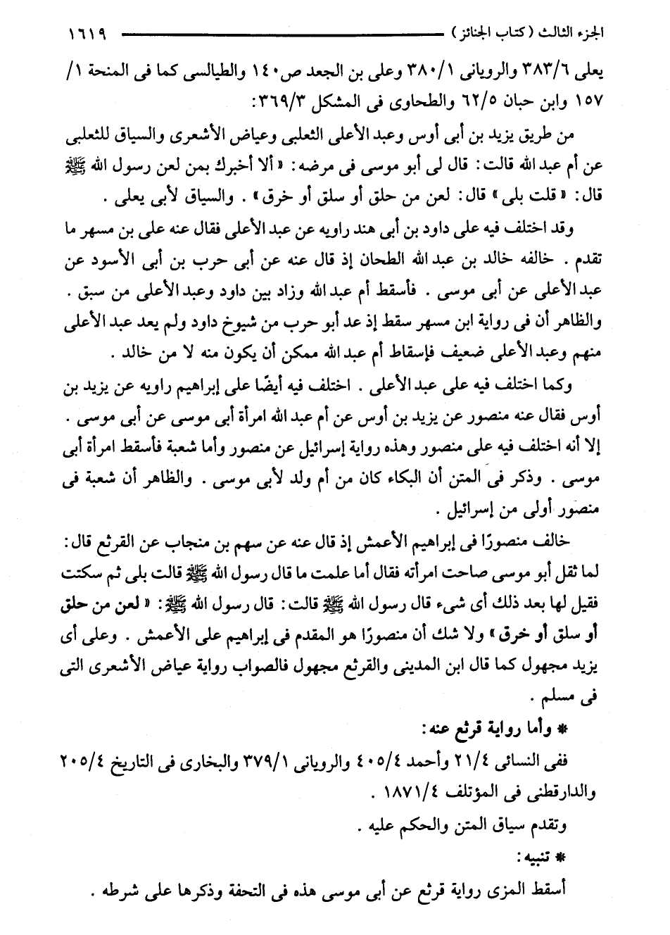 وقد اختلف فيه على داود بن أبى هند راويه عن عبد الأعلى فقال عنه على بن مسهر ما تقدم. خالفه خالد بن عبد الله الطحان إذ قال عنه عن أبى حرب بن أبى الأسود عن عبد الأعلى عن أبى موسى. فأسقط أم عبد الله وزاد بين داود وعبد الأعلى من سبق. والظاهر أن في رواية ابن مسهر سقط إذ عد أبو حرب من شيوخ داود ولم يعد عبد الأعلى منهم وعبد الأعلى ضعيف فإسقاط أم عبد الله ممكن أن يكون منه لا من خالد.