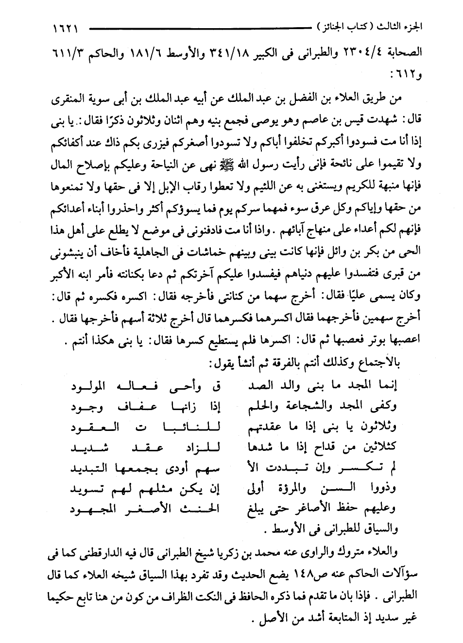 من طريق العلاء بن الفضل بن عبد الملك عن أبيه عبد الملك بن أبى سوية المنقرى قال: شهدت قيس بن عاصم وهو يوصى فجمع بنيه وهم اثنان وثلاثون ذكرًا فقال: يا بنى إذا أنا مت فسودوا أكبركم تخلفوا أباكم ولا تسودوا أصغركم فيزرى بكم ذاك عند أكفائكم ولا تقيموا على نائحة فإنى رأيت رسول الله - صلى الله عليه وسلم - نهى عن النياحة وعليكم بإصلاح المال فإنها منبهة للكريم ويستغنى به عن اللئيم ولا تعطوا رقاب الإبل إلا في حقها ولا تمنعوها من حقها وإياكم وكل عرق سوء فمهما سركم يوم فما يسوؤكم أكثر واحذروا أبناء أعدائكم فإنهم لكم أعداء على منهاج آبائهم. وإذا أنا مت فادفنونى في موضع لا يطلع على أهل هذا الحى من بكر بن وائل فإنها كانت بينى وبينهم خماشات في الجاهلية فأخاف أن ينبشونى من قبرى فتفسدوا عليهم دنياهم فيفسدوا عليكم آخرتكم ثم دعا بكنانته فأمر ابنه الأكبر وكان يسمى عليًا. فقال: أخرج سهما من كنانتى فأخرجه فقال: اكسره فكسره ثم قال: أخرج سهمين فأخرجهما فقال اكسرهما فكسرهما قال أخرج ثلاثة أصهم فأخرجها فقال. اعصبها بوتر فعصبها ثم قال: اكسرها فلم يستطيع كسرها فقال: يا بنى هكذا أنتم بالاجتماع وكذلك أنتم بالفرقة ثم أنشأ يقول: