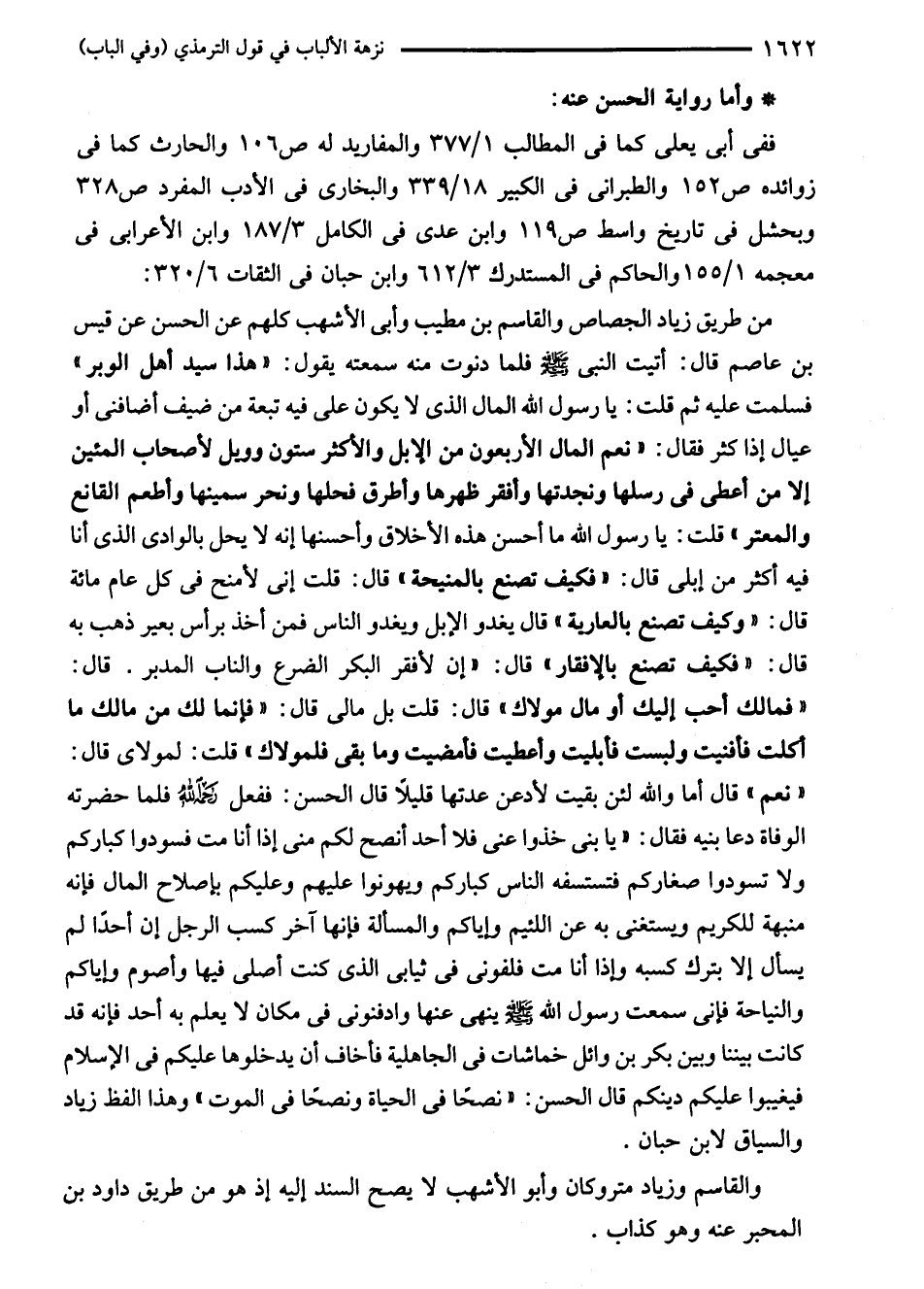 من طريق زياد الجصاص والقاسم بن مطيب وأبى الأشهب كلهم عن الحسن عن قيس بن عاصم قال: أتيت النبي - صلى الله عليه وسلم - فلما دنوت منه سمعته يقول: "هذا سيد أهل الوبر" فسلمت عليه ثم قلت: يا رسول الله المال الذى لا يكون على فيه تبعة من ضيف أضافنى أو عيال إذا كثر فقال: "نعم المال الأربعون من الابل والأكثر ستون وويل لأصحاب المئين إلا من أعطى في رسلها ونجدتها وأفقر ظهرها وأطرق فحلها ونحر سمينها وأطعم القانع والمعتر" قلت: يا رسول الله ما أحسن هذه الأخلاق وأحسنها إنه لا يحل بالوادى الذى أنا فيه أكثر من إبلى قال: "فكيف تصنع بالمنيحة" قال: قلت إنى لأمنح في كل عام مائة قال: "وكيف تصنع بالعارية" قال يغدو الإبل ويغدو الناس فمن أخذ برأس بعير ذهب به قال: "فكيف تصنع بالإفقار، قال: "إن لأفقر البكر الضرع والناب المدبر. قال: "فمالك أحب اليك أو مال مولاك" قال: قلت بل مالى قال: "فإنما لك من مالك ما أكلت فأفنيت ولبست فأبليت وأعطيت فأمضيت وما بقى فلمولاك" قلت: لمولاى قال: "نعم" قال أما والله لئن بقيت لأدعن عدتها قليلاً قال الحسن: ففعل -رحمه الله- فلما حضرته الوفاة دعا بنيه فقال: "يا بنى خذوا عنى فلا أحد أنصح لكم منى إذا أنا مت فسودوا كباركم ولا تسودوا صغاركم فتستسفه الناس كباركم ويهونوا عليهم وعليكم بإصلاح المال فإنه منبهة للكريم ويستغنى به عن اللئيم وإياكم والمسألة فإنها آخر كسب الرجل إن أحدًا لم يسأل إلا بترك كسبه وإذا أنا مت فلفونى في ثيابى الذى كنت أصلى فيها وأصوم وإياكم والنياحة فإنى سمعت رسول الله - صلى الله عليه وسلم - ينهى عنها وادفنونى في مكان لا يعلم به أحد فإنه قد كانت بيننا وبين بكر بن وائل خماشات في الجاهلية فأخاف أن يدخلوها عليكم في الإسلام فيغيبوا عليكم دينكم قال الحسن: "نصحًا في الحياة ونصحًا في الموت" وهذا الفظ زياد والسياق لابن حبان.