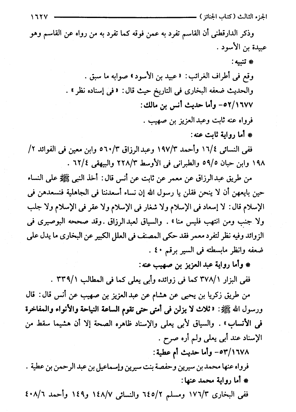 من طريق عبد الرزاق عن معمر عن ثابت عن أنس قال: أخذ النبي - صلى الله عليه وسلم - على النساء حين بايعهن أن لا ينحن فقلن يا رسول الله إن نساء أسعدننا في الجاهلية فنسعدهن في الإسلام قال: لا إسعاد في الإسلام ولا شغار في الإسلام ولا عقر في الإسلام ولا جلب ولا جنب ومن انتهب فليس منا". والسياق لعبد الرزاق. وقد صححه البوصيرى في الزوائد وفيه نظر لتفرد معمر فقد حكى المصنف في العلل الكبير عن البخاري ما يدل على ضعفه وانظر مابسطته في السير برقم 40.