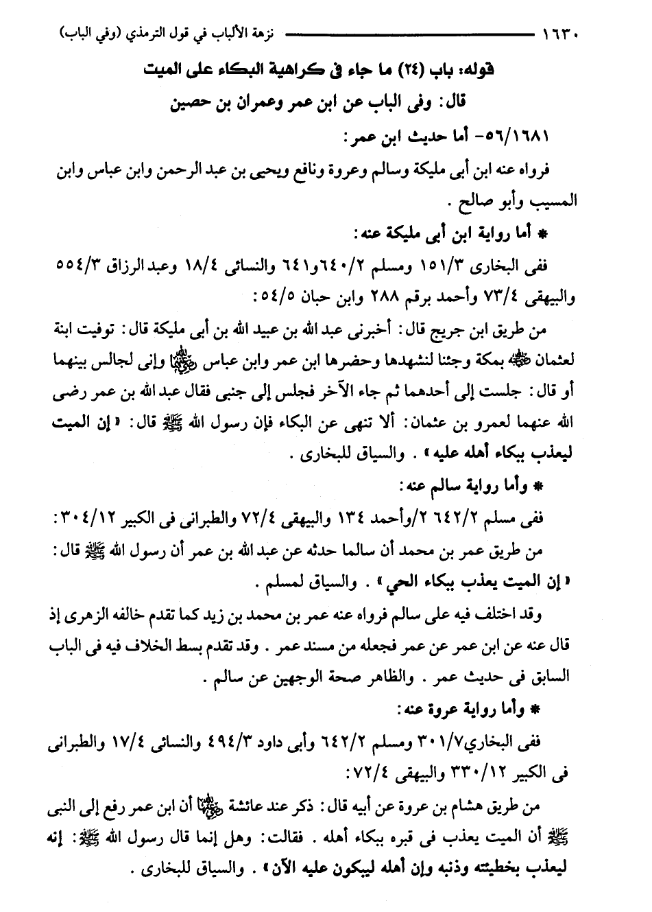 من طريق ابن جريج قال: أخبرنى عبد الله بن عبيد الله بن أبى مليكة قال: توفيت ابنة لعثمان - رضي الله عنه - بمكة وجئنا لنشهدها وحضرها ابن عمر وابن عباس - رضي الله عنهما - وإنى لجالس بينهما أو قال: جلست إلى أحدهما ثم جاء الآخر فجلس إلى جنبى فقال عبد الله بن عمر رضى الله عنهما لعمرو بن عثمان: ألا تنهى عن البكاء فإن رسول الله - صلى الله عليه وسلم - قال: "إن الميت ليعذب ببكاء أهله عليه". والسياق للبخاري.