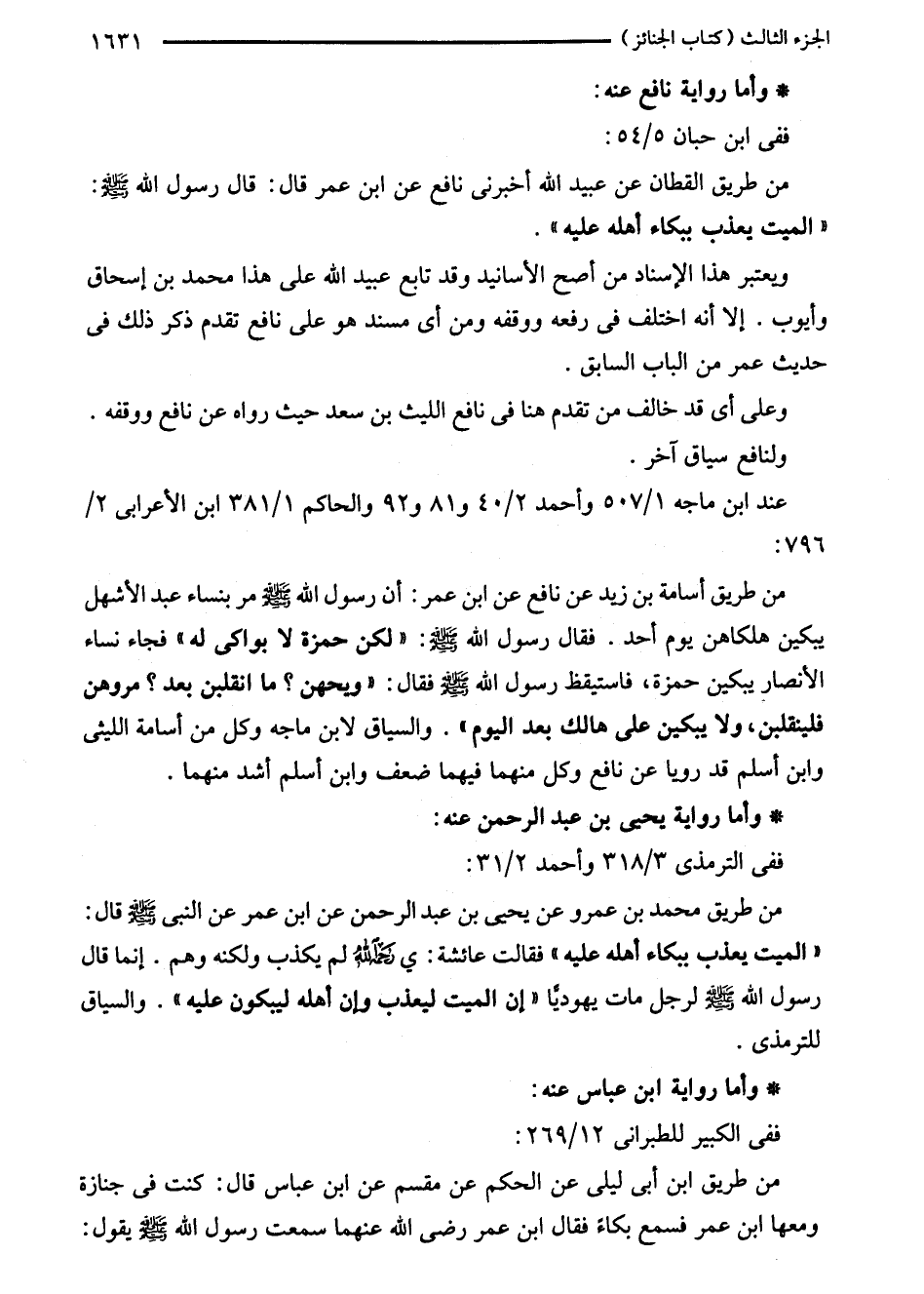 من طريق أسامة بن زيد عن نافع عن ابن عمر: أن رسول الله - صلى الله عليه وسلم - مر بنساء عبد الأشهل يبكين هلكاهن يوم أحد. فقال رسول الله - صلى الله عليه وسلم -: "لكن حمزة لا بواكى له" فجاء نساء الأنصار يبكين حمزة، فاستيقظ رسول الله - صلى الله عليه وسلم - فقال: "ويحهن؟ ما انقلبن بعد؟ مروهن فلينقلبن، ولا يبكين على هالك بعد اليوم". والسياق لابن ماجه وكل من أسامة الليثى وابن أسلم قد رويا عن نافع وكل منهما فيهما ضعف وابن أسلم أشد منهما.