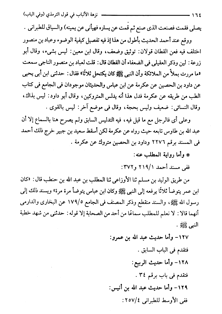 من طريق الوليد بن مسلم ثنا الأوزاعى ثنا المطلب بن عبد الله بن حنطب قال: "كان ابن عمر يتوضأ ثلاثًا يرفعه إلى النبي - صلى الله عليه وسلم - وكان ابن عباس يتوضأ مرة مرة" ويسند ذلك إلى رسول الله - صلى الله عليه وسلم -، والسند منقطع وذكر المصنف في الجامع 5/ 179 عن البخاري والدارمي أنهما قالا: لا نعلم للمطلب سماعًا من أحد من الصحابة إلا قوله: حدثنى من شهد خطبة النبي - صلى الله عليه وسلم -.