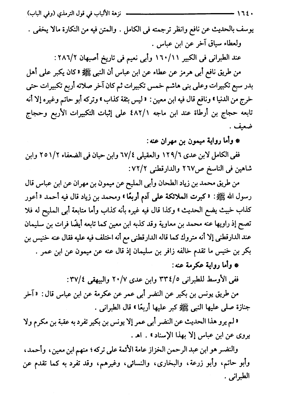 من طريق نافع أبى هرمز عن عطاء عن ابن عباس أن النبي - صلى الله عليه وسلم - كان يكبر على أهل بدر سبع تكبيرات وعلى بنى هاشم خمس تكبيرات ثم كان آخر صلاته أربع تكبيرات حتى خرج من الدنيا، ونافع قال فيه ابن معين: "ليس بثقة كذاب" وتركه أبو حاتم وغيره إلا أنه تابعه حجاج بن أرطاة عند ابن ماجه 1/ 482 على إثبات التكبيرات الأربع وحجاج ضعيف.