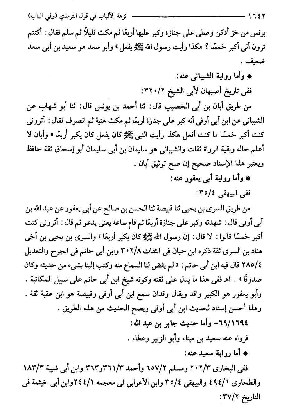 من طريق السرى بن يحيى ثنا قبيصة ثنا الحسن بن صالح عن أبى يعفور عن عبد الله بن أبى أوفى قال: شهدته وكبر على جنازة أربعًا ثم قام ساعة يعنى يدعو ثم قال: أترونى كنت أكبر خمسا قالوا: لا قال: إن رسول الله - صلى الله عليه وسلم - كان يكبر أربعًا" والسرى بن يحيى بن أخى هناد بن السرى ثقة ذكره ابن حبان في الثقات 8/ 302 وابن أبى حاتم في الجرح والتعديل 4/ 285 قال فيه ابن أبى حاتم: "لم يقض لنا السماع منه وكتب إلينا بشىء من حديثه وكان صدوقًا". اهـ ففي هذا ما يدل على ثقته وكونه شيخ ابن أبى حاتم على سبيل المكاتبة. وأبو يعفور هو الكبير واقد ويقال وقدان سمع ابن أبى أوفى وقبيصة هو ابن عقبة ثقة. وهذا أحسن إسناد لحديث ابن أبى أوفى ويصح الحديث من هذه الطريق.