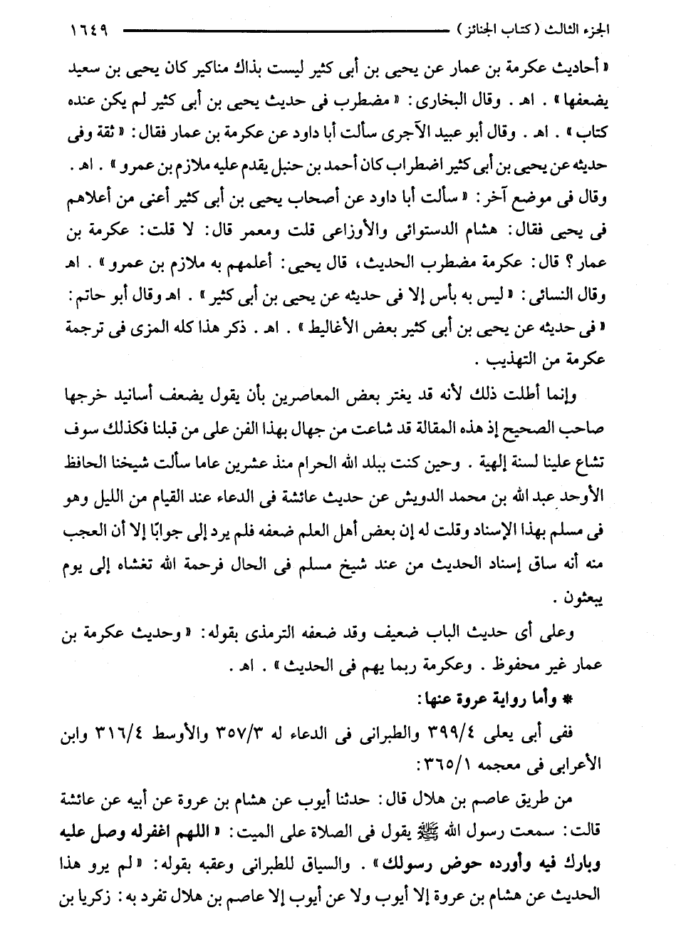 وإنما أطلت ذلك لأنه قد يغتر بعض المعاصرين بان يقول يضعف أسانيد خرجها صاحب الصحيح إذ هذه المقالة قد شاعت من جهال بهذا الفن على من قبلنا فكذلك سوف تشاع علينا لسنة إلهية. وحين كنت ببلد الله الحرام منذ عشرين عاما سألت شيخنا الحافظ الأوحد عبد الله بن محمد الدويش عن حديث عائشة في الدعاء عند القيام من الليل وهو في مسلم بهذا الإسناد وقلت له إن بعض أهل العلم ضعفه فلم يرد إلى جوابًا إلا أن العجب منه أنه ساق إسناد الحديث من عند شيخ مسلم في الحال فرحمة الله تغشاه إلى يوم يبعثون.