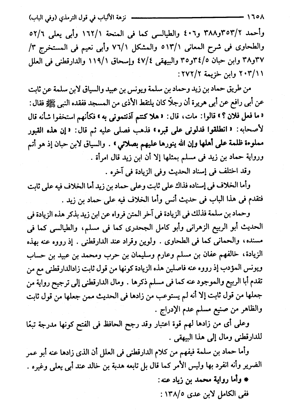 وحماد بن سلمة فذلك في الزيادة في آخر المتن فرواه عن ابن زيد بذكر هذه الزيادة في الحديث أبو الربيع الزهرانى وأبو كامل الجحدرى كما في مسلم، والطيالسى كما في مسنده، والحمانى كما في الطحاوى. ولوين وقراد عند الدارقطني. إذ رووه عنه بهذه الزيادة، خالفهم عفان بن مسلم وعارم وسليمان بن حرب ومحمد بن عبيد بن حساب ويونس المؤدب إذ رووه عنه فاصلين هذه الزيادة كونها من قول ثابت زاد الدارقطني مع من تقدم أبا الربيع والموجود عنه كما في مسلم ذكرها. ومال الدارقطني إلى ترجيح رواية من جعلها من قول ثابت إلا أنه لم يستوعب من زادها في الحديث ممن جعلها من قول ثابت والظاهر من صنيع مسلم عدم الإدراج.