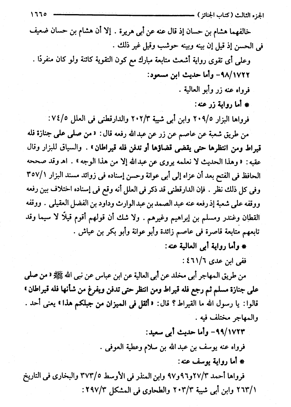 من طريق شعبة عن عاصم عن زر عن عبد الله رفعه قال: "من صلى على جنازة فله قيراط ومن انتظرها حتى يقض قضاؤها أو تدفن فله قيراطان". والسياق للبزار وقال عقبه: "وهذا الحديث لا نعلمه يروى عن عبد الله إلا من هذا الوجه". اهـ وقد صححه الحافظ في الفتح بعد أن عزاه إلى أبى عوانة وحسن إسناده في زوائد مسند البزار 1/ 357 وفى كل ذلك نظر. فإن الدارقطني قد ذكر في العلل أنه وقع في إسناده اختلاف بين رفعه ووقفه على شعبة إذ رفعه عنه عبد الصمد بن عبد الوارث وداود بن الفضل العقيلى. ووقفه القطان وغندر ومسلم بن إبراهيم وغيرهم. ولا شك أن قولهم أقوم قيلاً لا سيما وقد تابعهم متابعة قاصرة في عاصم زائدة وأبو عوانة وأبو بكر بن عياش.